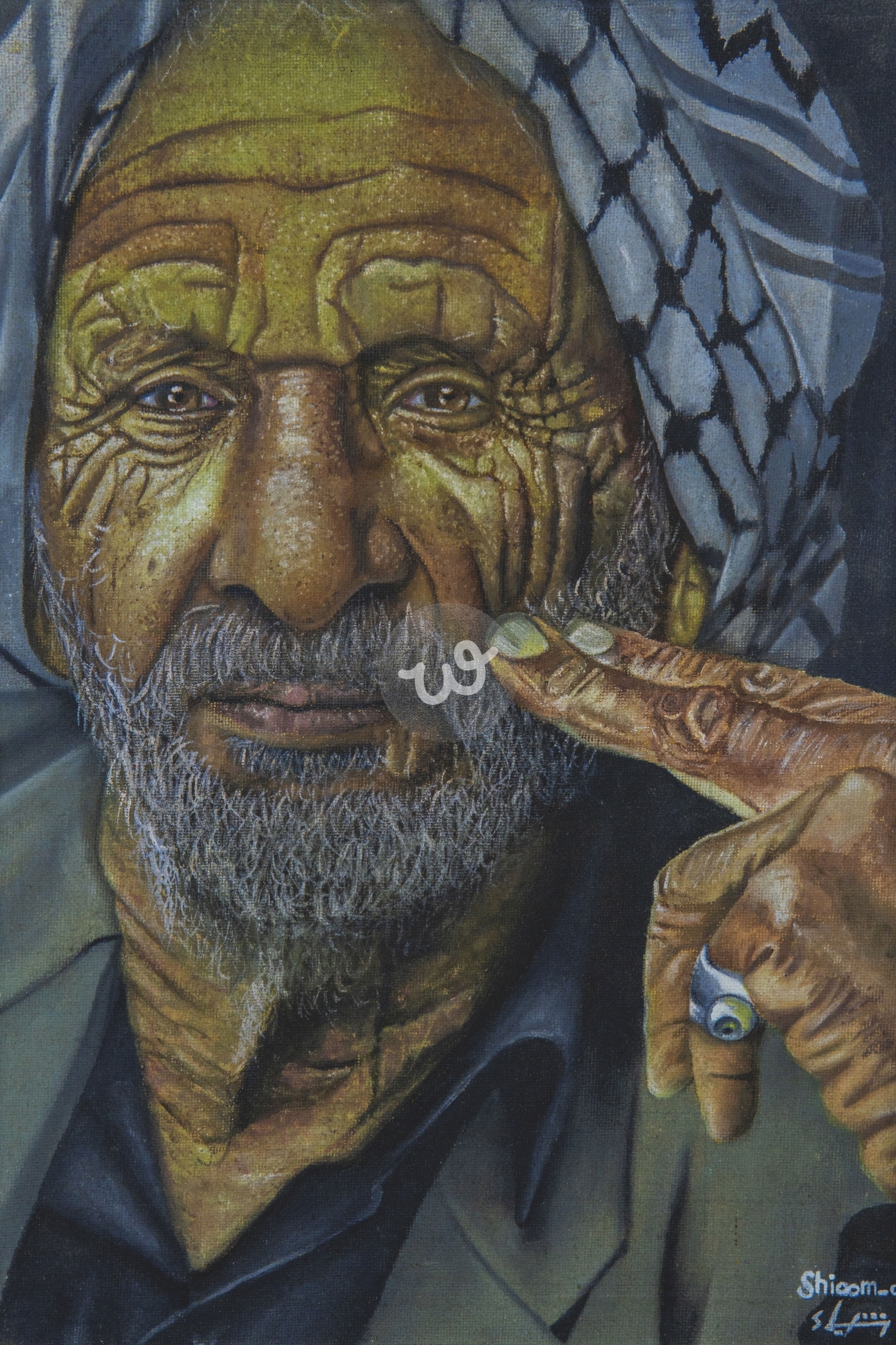 تعكس ثِقل الزمن على وجه شيخٍ يحمل ملامح الحكايات والتجارب التي سُطرت في كل تجعيدة من تجاعيده. نظراته العميقة ليست مجرد انعكاس للعين، بل نافذة إلى تاريخ طويل من الصبر والمعاناة، كأنها تحكي قصصاً لم تُروَ بعد. التجاعيد المتشابكة على وجهه أشبه بخارطة للحياة، تحدد تضاريس الألم والأمل، وكأنها أثرٌ لسنوات من الكفاح والمقاومة