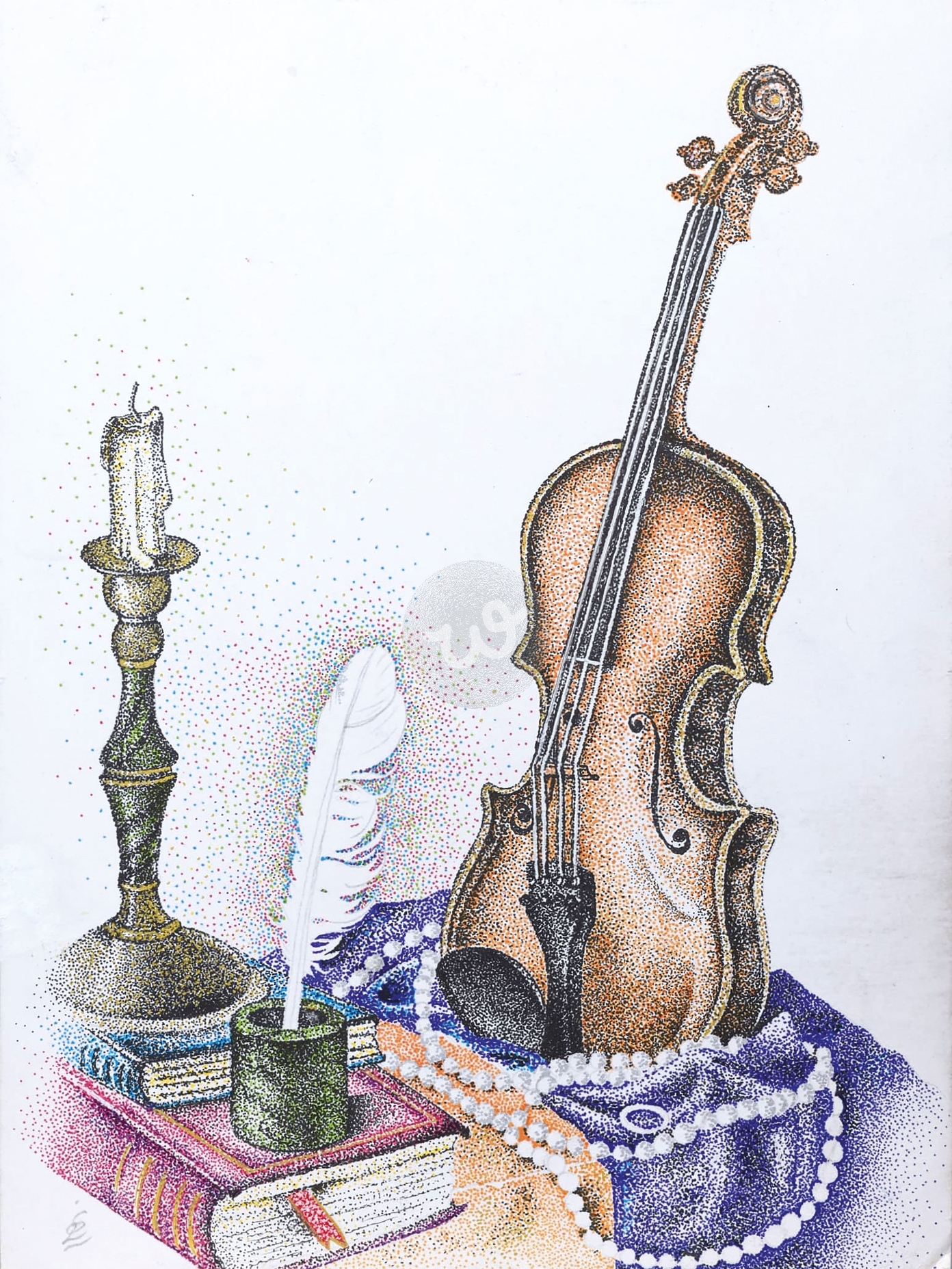 رسم فني يظهر كمانًا قديمًا بجوار شمعة مضاءة، وريشة كتابة موضوعة في محبرة، مع بعض الكتب واللؤلؤ. تعكس الصورة طابعًا كلاسيكيًا وأنيقًا يرمز إلى الفن والموسيقى والأدب