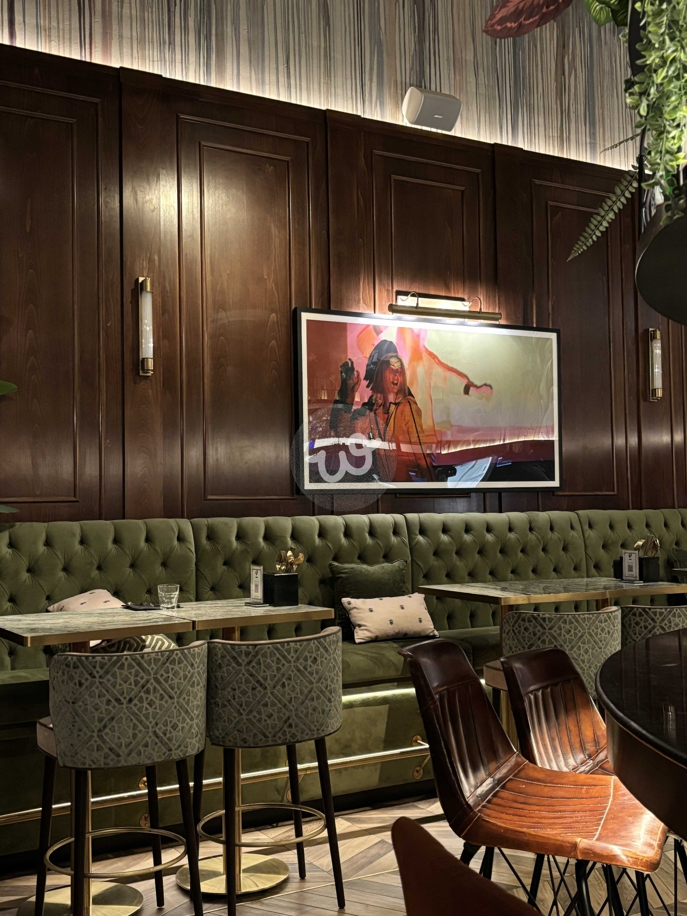 ركن جلوس أنيق داخل مقهى يتميز بكراسي مريحة وطاولة مرتبة وأريكة خضراء مزينة بوسائد، مع لوحة مضيئة تضيف لمسة فنية للمكان