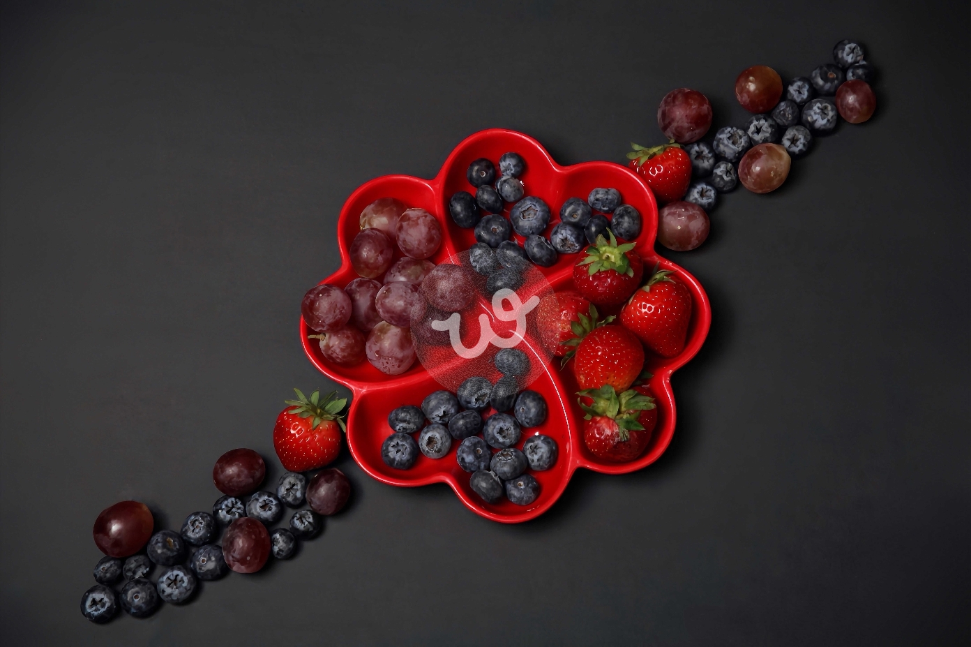 طبق أحمر على شكل زهرة يحتوي على فراولة، عنب، وتوت أزرق مع تنسيق إضافي من الفواكه على الطاولة السوداء