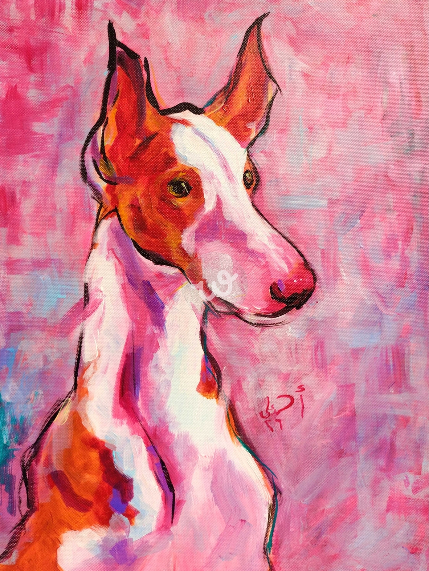 لوحه فنيه لكلب مرسومه باليد الوان اكريليك على توال قماش بطريقه تعبيريه