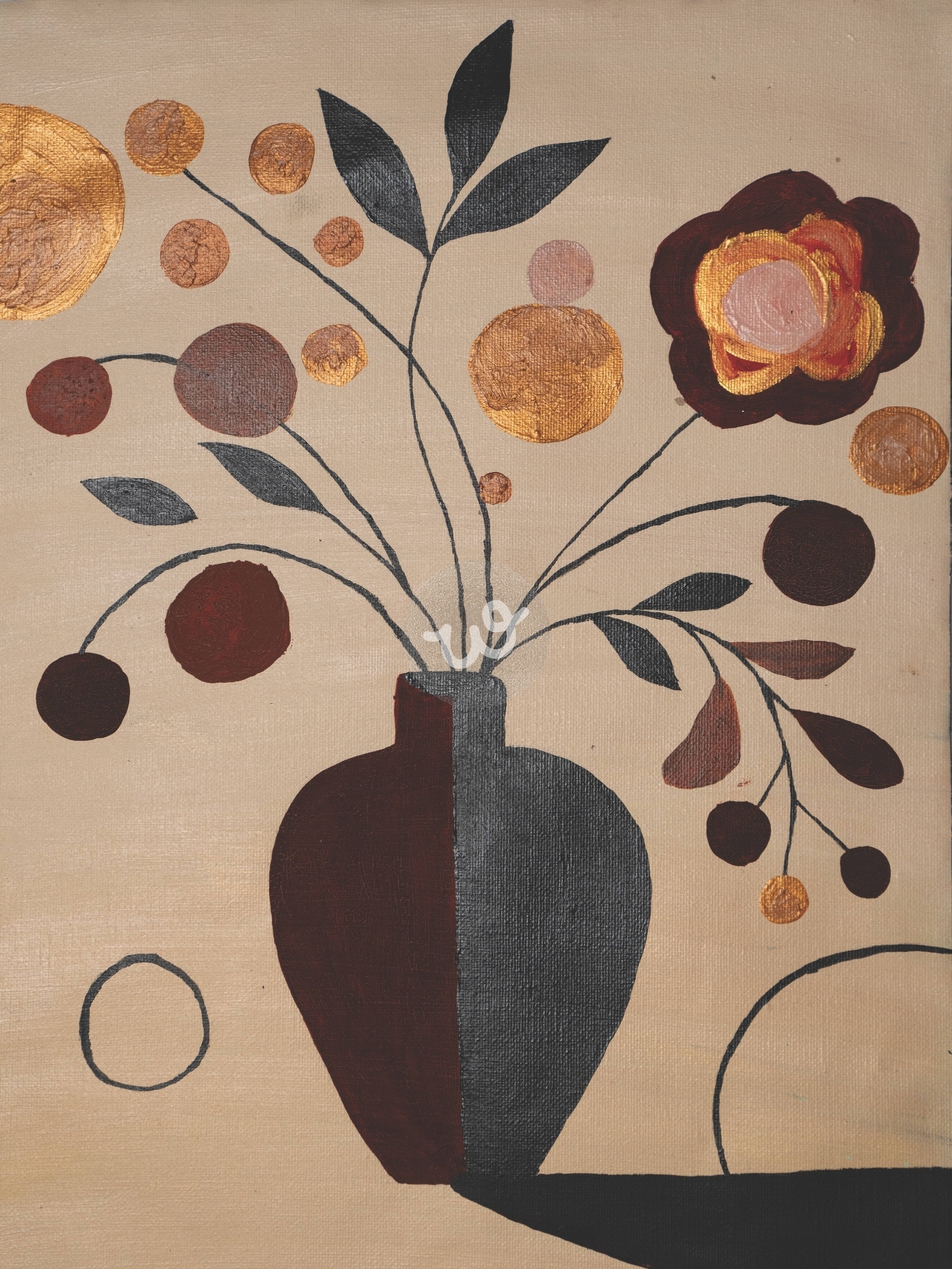 هذه اللوحة تحمل طابعًا بسيطًا وأنيقًا يمزج بين الأسلوب التجريدي والواقعي، حيث يظهر إناء زهور بلمسات فنية تعبيرية. الخطوط السوداء الرفيعة للأغصان والأوراق تضيف إحساسًا بالانسيابية، بينما الألوان الدافئة مثل الأحمر، البرتقالي، والذهبي تمنحها طابعًا حيويًا ودافئًا. الظلال القوية على الجانب الأيمن تضيف بُعدًا وعمقًا للمشهد، مما يعزز التوازن البصري.