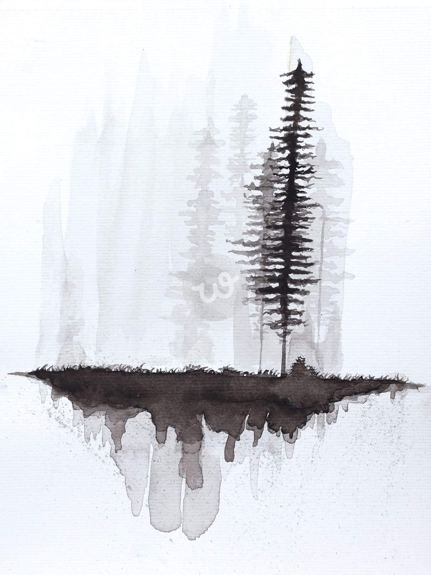 لوحة بالألوان المائية بأسلوب تجريدي، حيث تظهر أشجار سوداء على خلفية بيضاء مع انعكاس لها في الأسفل، مما يمنح الصورة مظهرًا ضبابيًا وسرياليًا