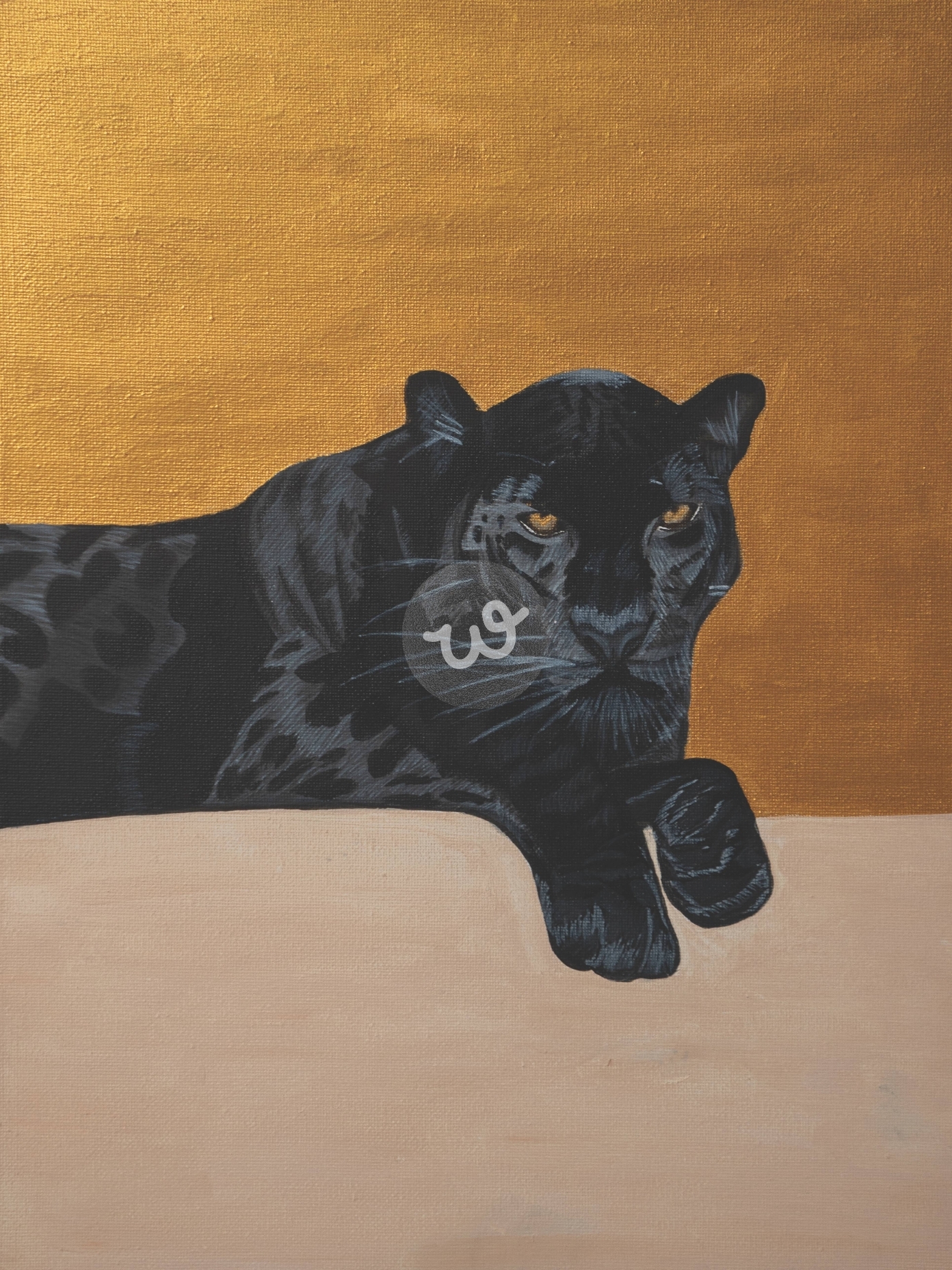 تجسد هذه اللوحة فهداً أسود مسترخياً بنظرة ثابتة تخترق الصمت، تحيط به خلفية ذهبية تعكس قوته المهيبة. تجمع التفاصيل بين الظلال الداكنة واللمسات الدافئة، مما يبرز التناقض بين الغموض والفخامة. تعبر اللوحة عن السكون الحذر، حيث يترقب المفترس لحظته دون استعجال