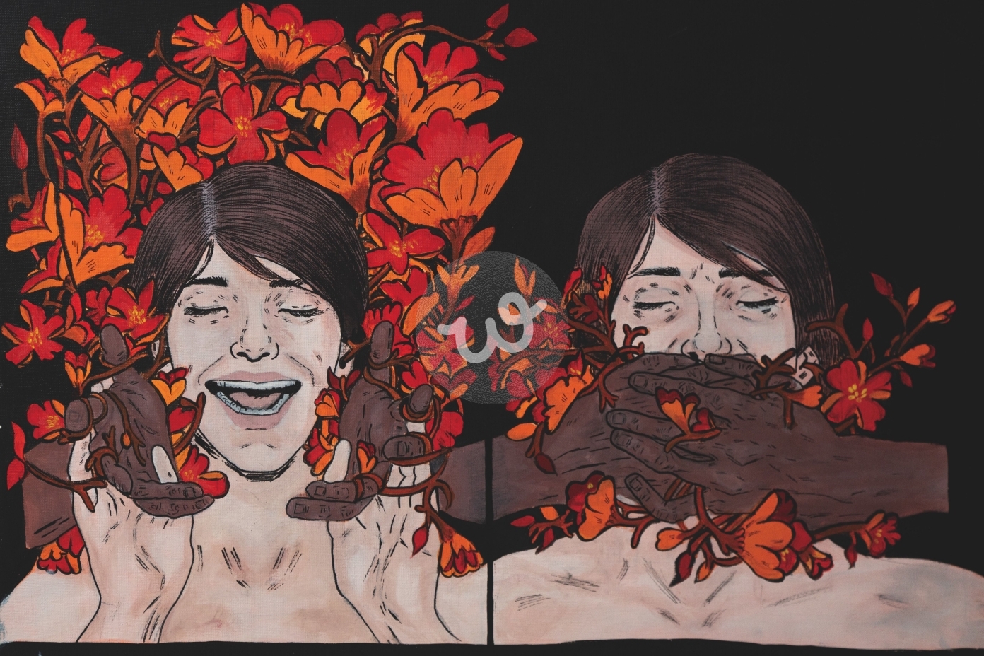تُظهر اللوحة شخصين مع خلفية من الزهور البرتقالية والحمراء. الأيدي الداكنة تمسك برقبة الشخصين، مما يضفي شعورًا بالغموض والتوتر. تبرز اللوحة تباين الألوان بين الخلفية الداكنة والزهور الزاهية، مما يجعلها ملفتة للنظر ومثيرة للاهتمام
