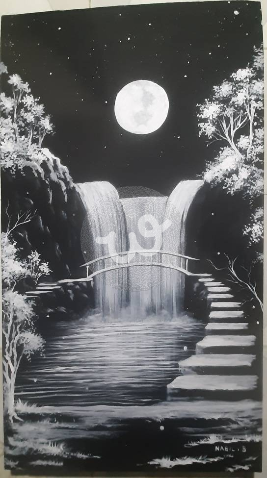 تقدّم اللوحة بالأبيض والأسود منظرًا ليليًا يتوسطه قمر ينعكس ضوؤه على مياه الشلال، بينما يقسم الجسر المشهد بهدوء. يبرز غياب اللون قوة التباين بين الضوء والظل، ويمنح العمل طابعًا تأمليًا يعكس السكون والعمق والغموض في المشهد الليلي