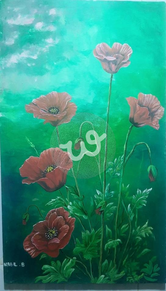 تصوّر اللوحة خلفية خضراء تنبثق منها ورود حمراء كما في الطبيعة، تنمو من الأسفل بثبات وحيوية. يبرز التباين بين الأخضر والأحمر جمال التكوين الطبيعي، ويعكس العمل إحساسًا بالحياة والتوازن والانسجام بين عناصر الطبيعة.