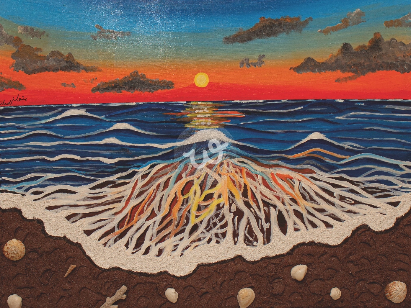 تعكس هذه اللوحة مشهداً فريداً يجمع بين هدوء الغروب وحركة البحر المتواصلة تتدرج ألوان السماء من الأزرق العميق إلى البرتقالي الدافئ ، حيث تعكس الشمس أشعتها على سطح الماء مكونة منظراً ساحراً . الموج المتحرك يبدو وكأنه يمتد . إلى اليابسة بطريقة غير مألوفة ، حيث يتحول زبد البحر إلى خيوط طويلة متداخلة ، وكأنها تربط البحر بالأرض في تمازج فني رائع الأصداف المنتشرة على الرمال تضيف بعداً حسياً للوحة ، مما يمنحها واقعية وتأثيراً جمالياً.