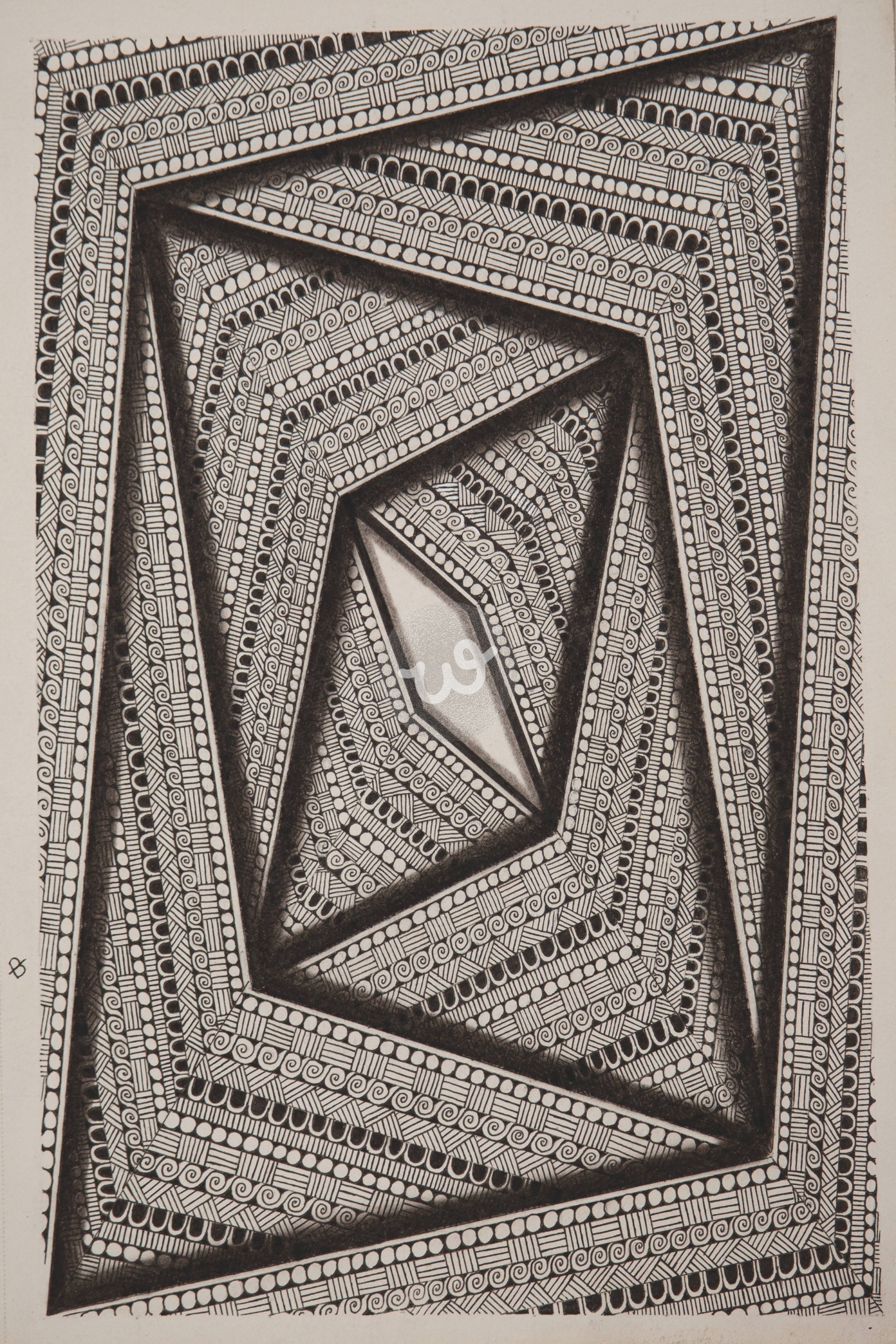 هذه لوحة رسم تخطيطي معقدة ومتشابكة تشبه نمط الماندالا التقليدي. تتكون من شبكة متداخلة من الأشكال الهندسية المتناظرة، بما في ذلك المثلثات والدوائر والخطوط المتموجة. تتداخل هذه العناصر بطريقة تخلق إحساسًا بالحركة والديناميكية البصرية. تم استخدام الظل والضوء بشكل ماهر لإضفاء عمق وبعد على اللوحة، مما يعزز الإحساس بالبعد الثالث.