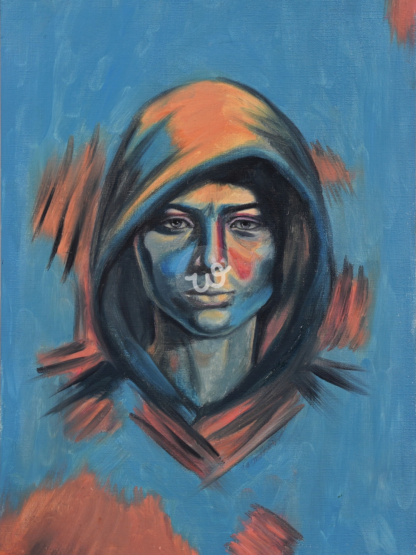 بورترية لصورة إمرأة باللون الأزرق . استخدم فيه الالوان الزيتية على الورق