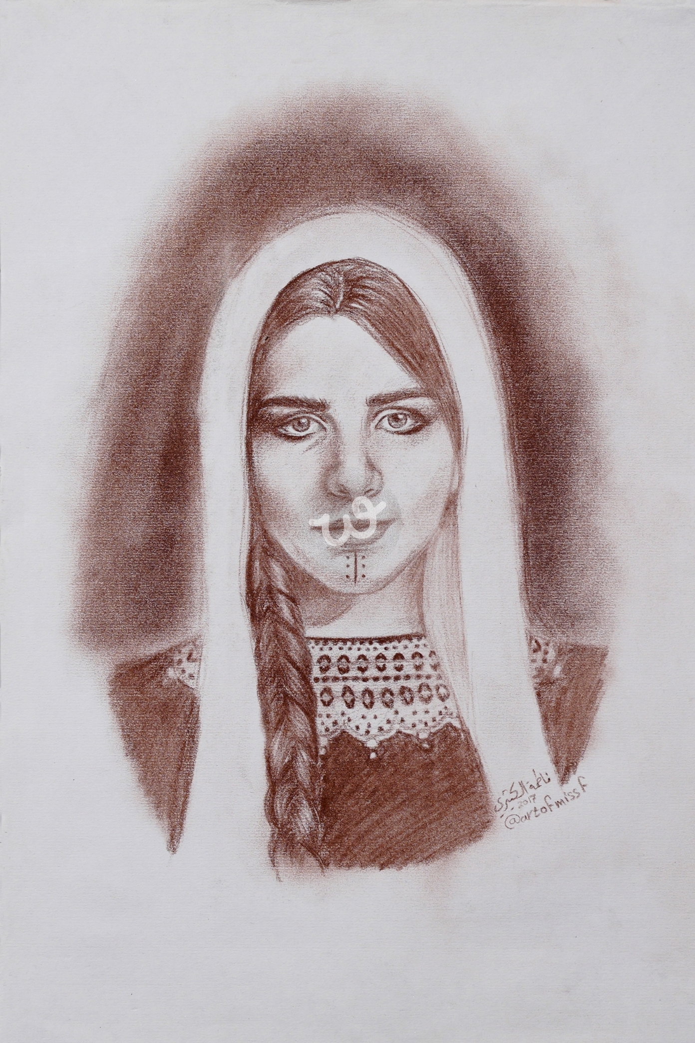 رسمة بورترية بأقلام الفحم باللون البيت مع بعض التفاصيل اليمنية التي تميزها