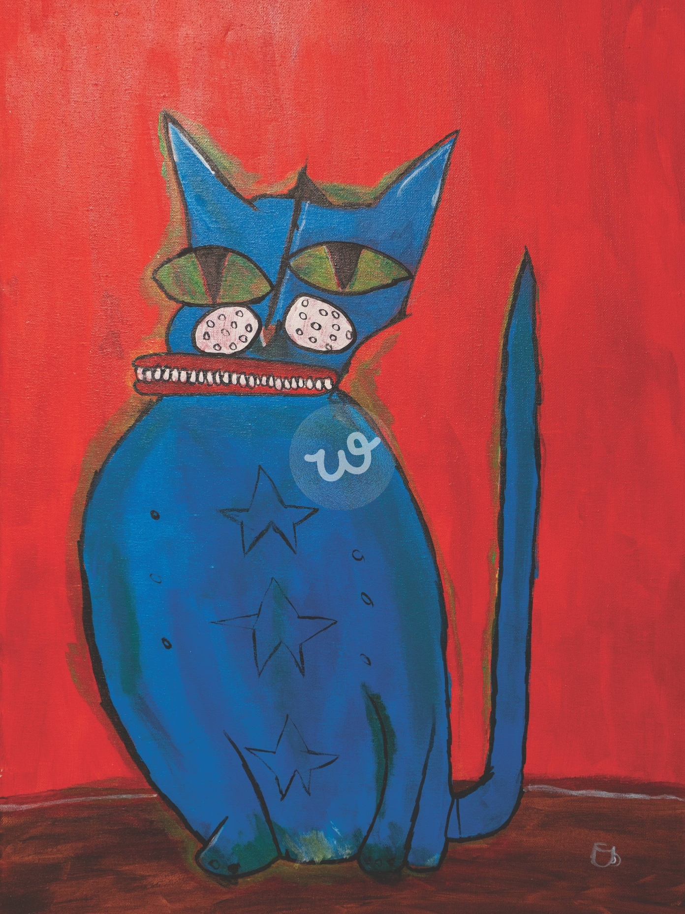 هذه اللوحة تجسد قطة زرقاء كبيرة بعيون خضراء واسعة تعكس الفضول والحيوية، وأذنين كبيرتين تضيفان لمسة من الطرافة. جسم القطة مزين بنجوم بيضاء تضفي عليها إحساسًا بالسحر والخيال، مع خلفية حمراء تضيف قوة وتباينًا لونيًا جذابًا. العمل يبرز بأسلوبه الجريء وألوانه الزاهية، مما يجعله مفعمًا بالحياة والإبداع.