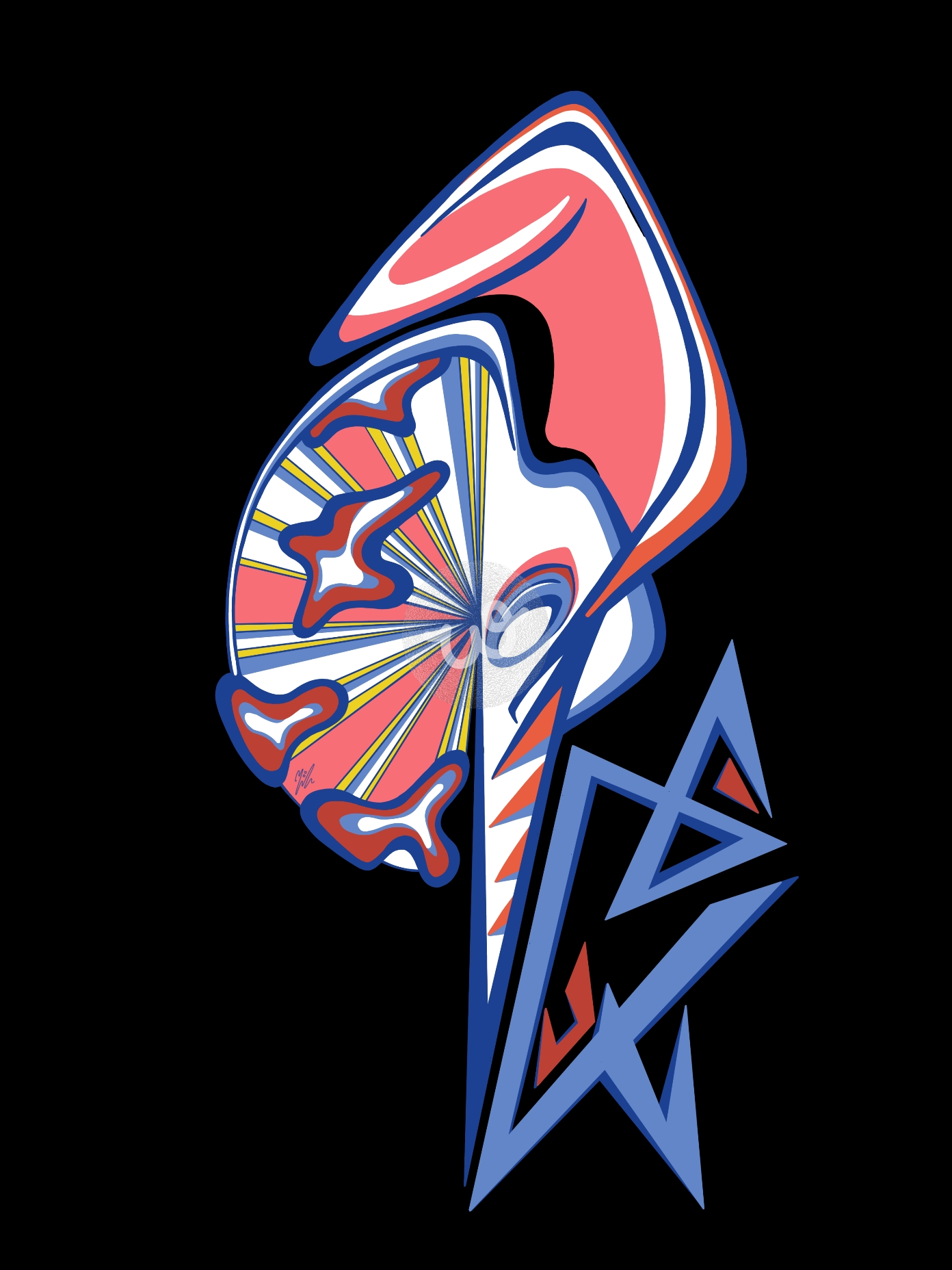 لوحة تدمج بين اثنين يحلقان عاليًا، تظهر فيها تفاصيل وجه حيوان الكنغر وعجلة مدينة الملاهي العملاقة المجاورة الغيوم.