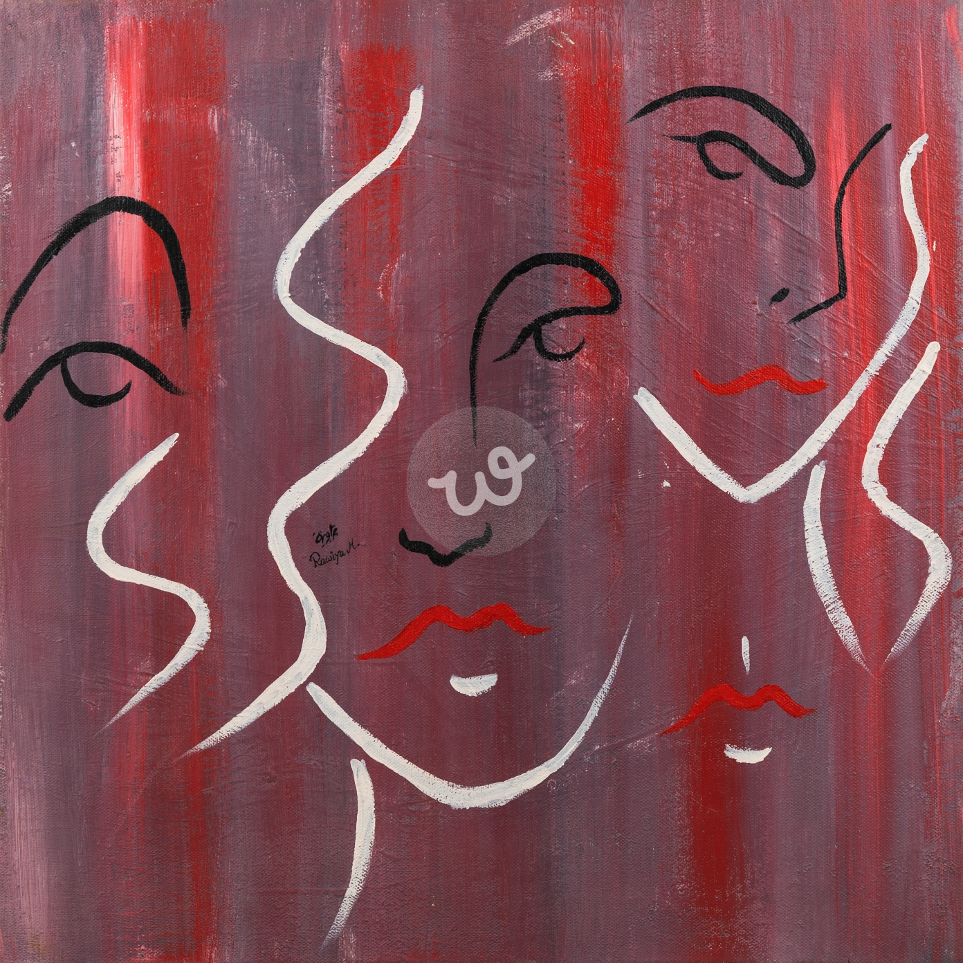هذه اللوحة مرسومة بشكل تجريدي ،استخدمت فيها ألوان اكريليك على قماش ،يبرز فيها ملامح وجوه غير واقعية وتختلف تعابير الوجوه من وجه للآخر
