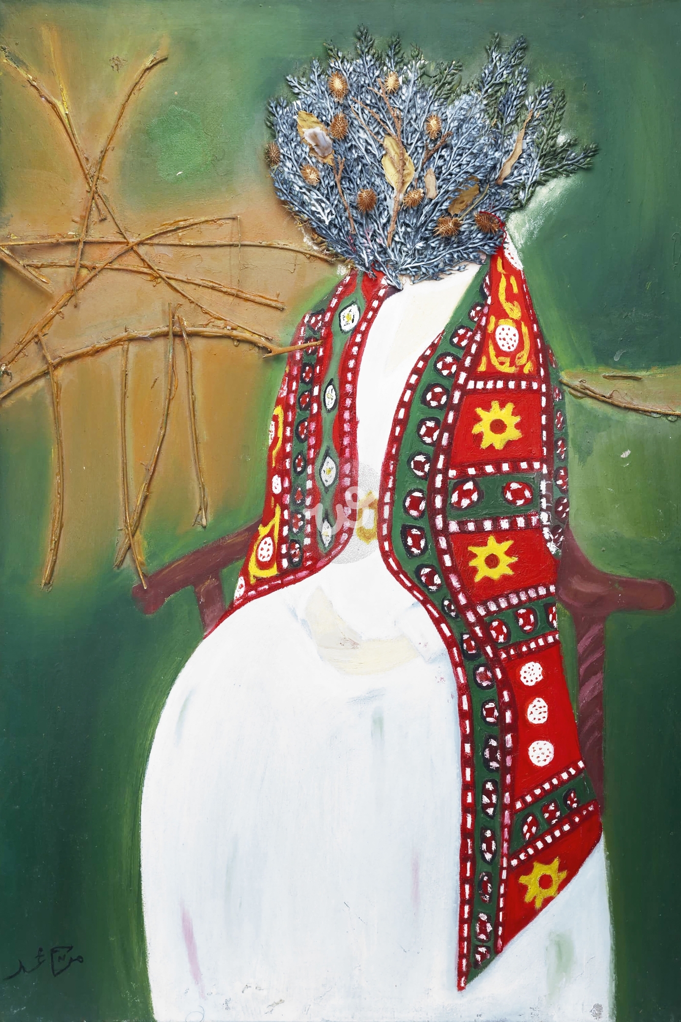 لوحة تعبر عن جمال المرأة والتراث بألوان زاهية،ترتدي المرأة شالًا ملونًا بتصميم تقليدي، يعكس الثقافة والتراث وتعكس اللوحة الأناقة البسيطة والعمق الروحي.