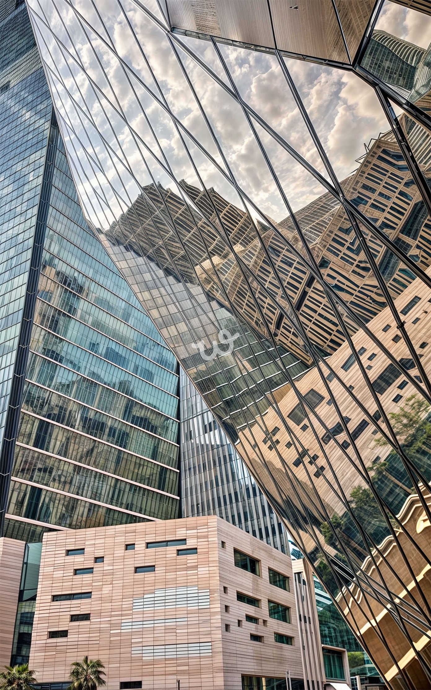 صورة فوتوغرافية لمباني المركز المالي، التُقطت بزاوية احترافية تُبرز انعكاسات المباني على بعضها البعض، لتجسد جمالية العمارة الحديثة في الرياض.