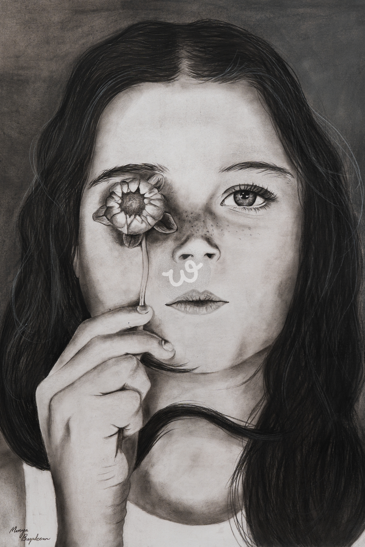 هذه اللوحة عباره عن بورترية لطفلة تمسك بزهرة وتضعها على عينها تعبيراً عن براءة الأطفال. رسمت هذه اللوحة بالقلم الرصاص و الفحم