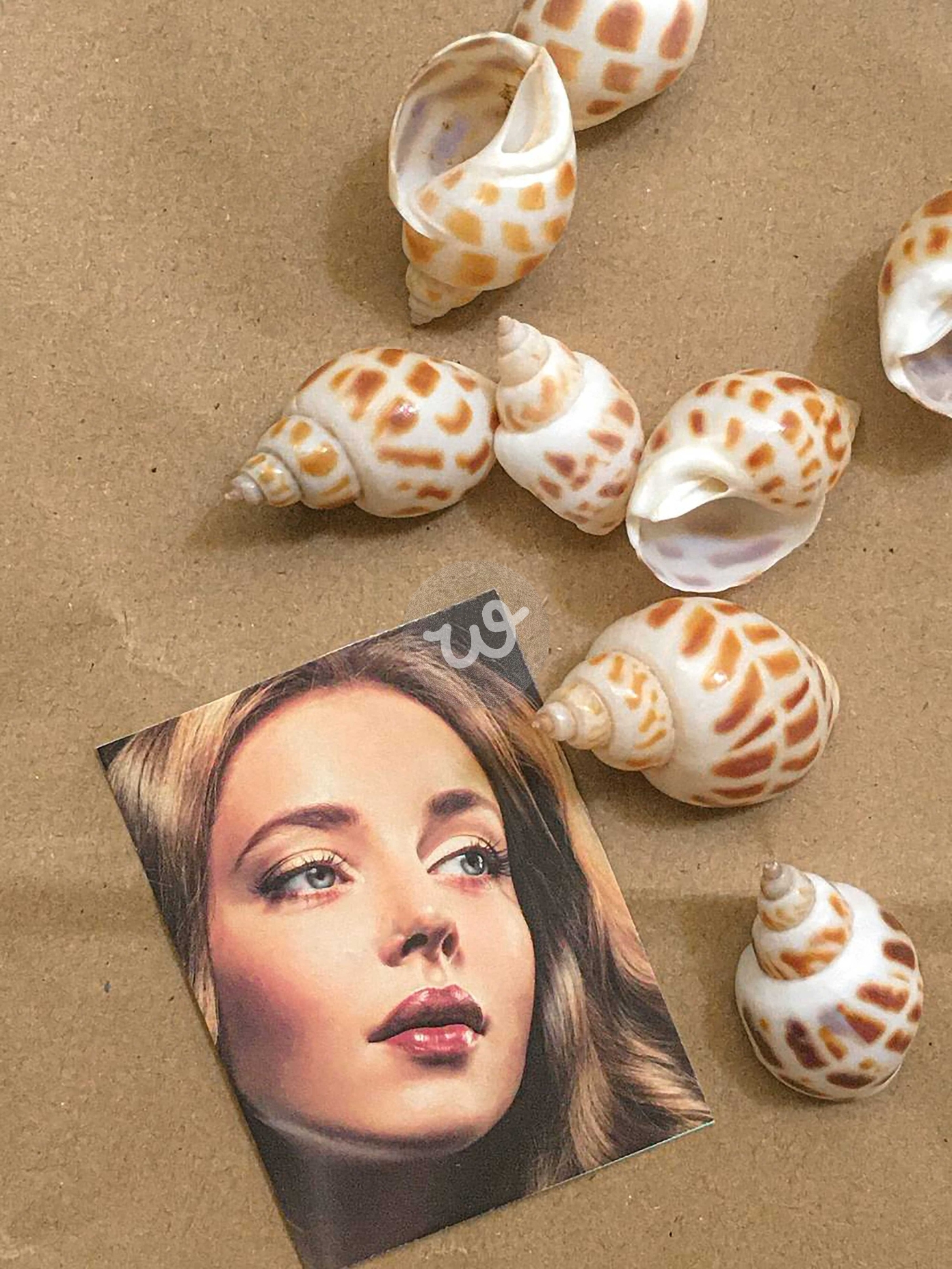صورة تجمع وجه أنثوي مطبوع مع صدف بحري متناثر حوله .