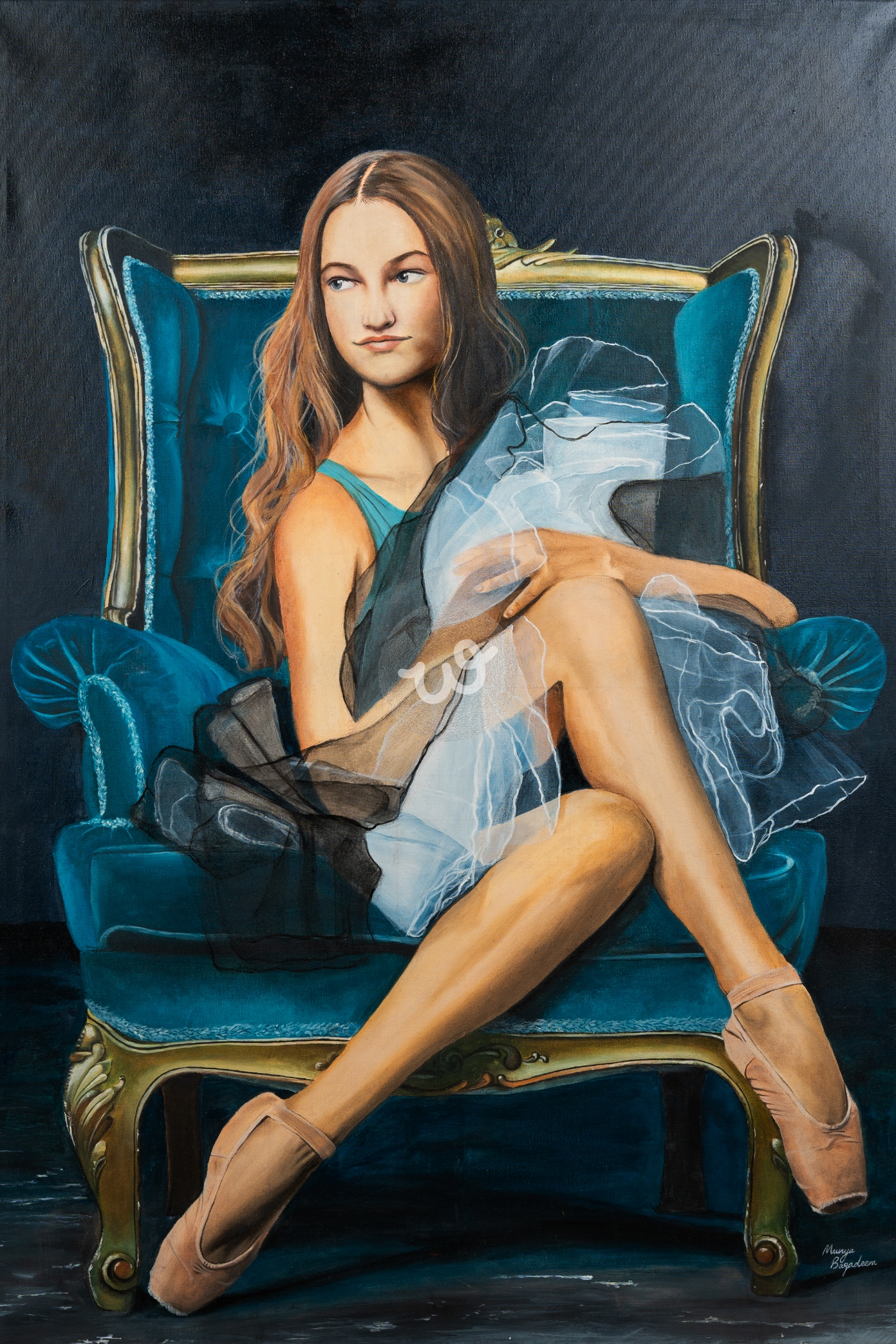 لوحة زيتية لفتاة البالية وهي جالسة على الكرسي متباهية بجمالها وبلبسها
