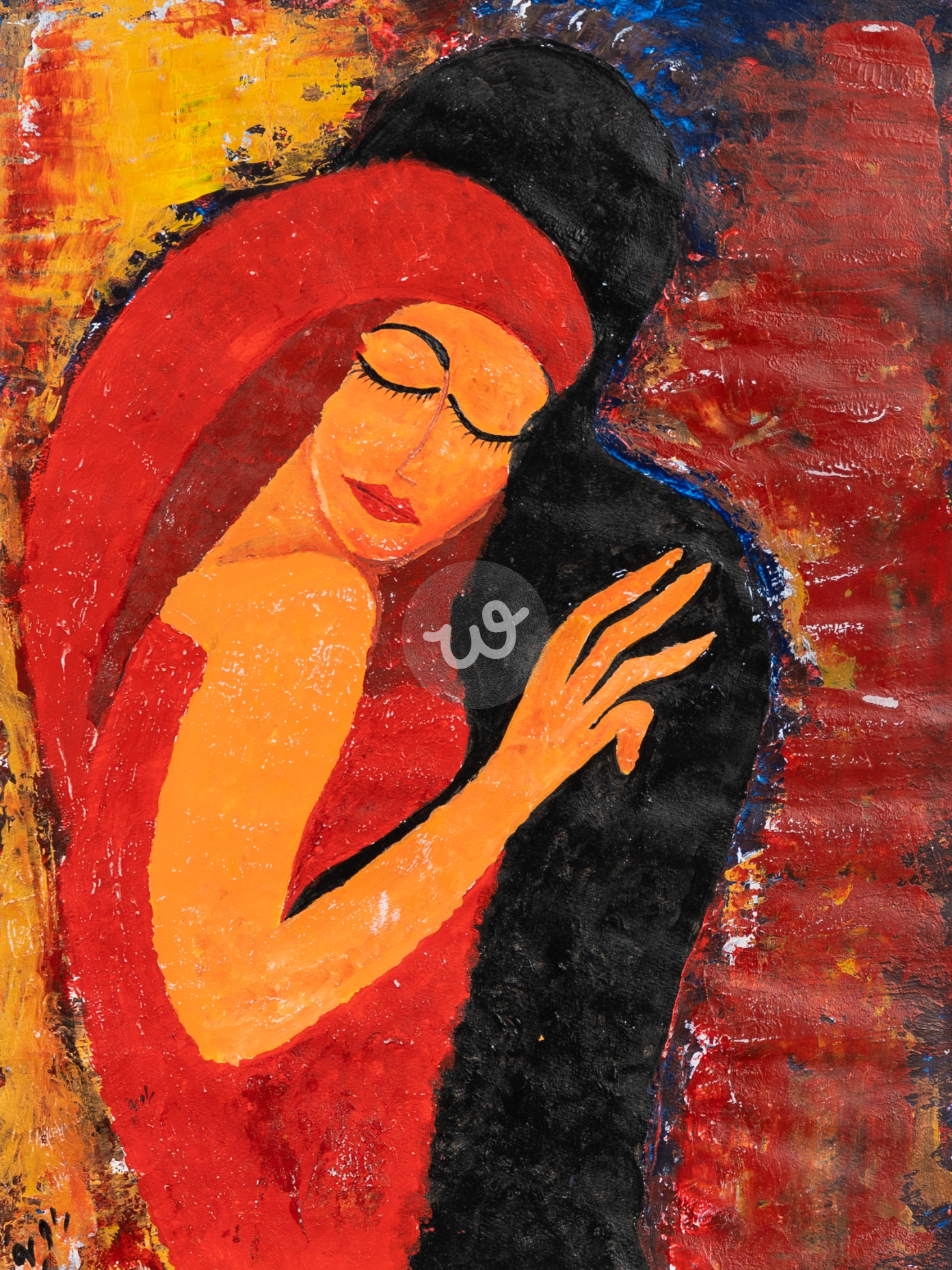 اللوحة تجسد حاجة المرأة إلى الأمان وقد رسمت هذه الصورة بالألوان الزيتية