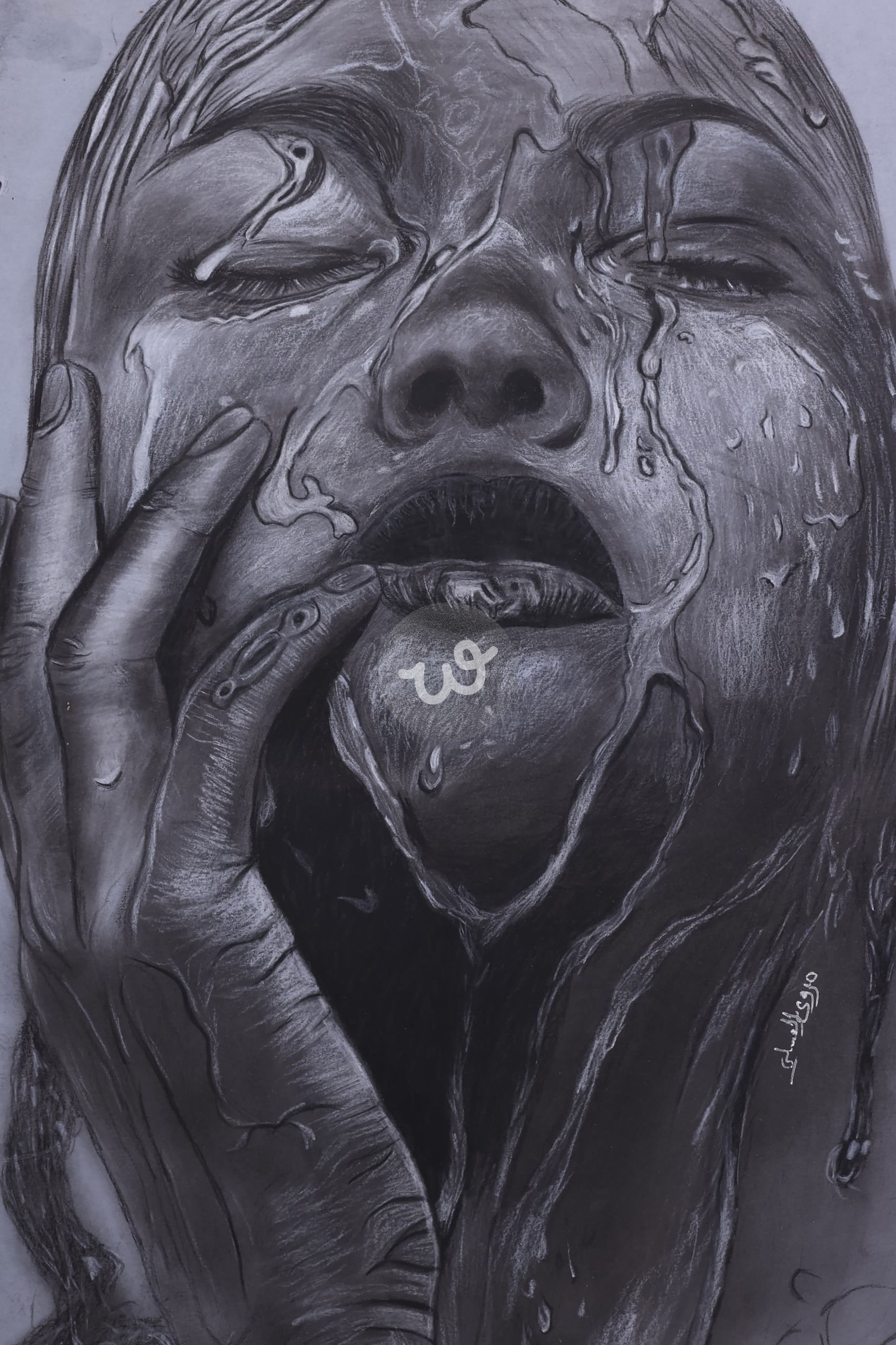"لوحة فحم طبيعية صامتة رائعة تظهر وجه فتاة مغمرة بقطرات الماء. الوجه الأنثوي يظهر في تناسق رائع مع القطرات المائية، مما يعكس جمال الطبيعة والحركة. اللوحة تظهر وجه الفتاة فقط، مما يضيف لمسة من الاختزال والتركيز على ملامح الوجه. هذا يجعلك تركز على تعبيرات الوجه وتفاصيلها الدقيقة. اللوحة بأكملها تعكس شعورًا بالجمال والهدوء، وتظهر جمال الطبيعة في تفاصيلها البسيطة. إنها لوحة فنية رائعة تعكس جمال اللوحات الفحمية الطبيعية الصامتة."