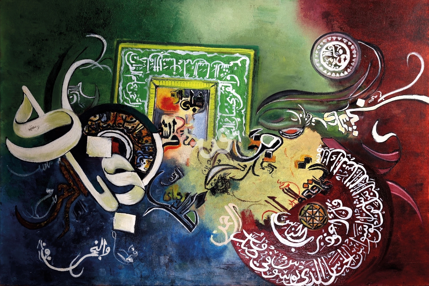 لوحة فنية تجمع بين الخط العربي والألوان الزاهية،تتداخل الخطوط العربية بشكل معقد، مما يعكس جمال اللغة وثقافتها والألوان المتنوعة تعبر عن الحيوية والعمق الروحي.
