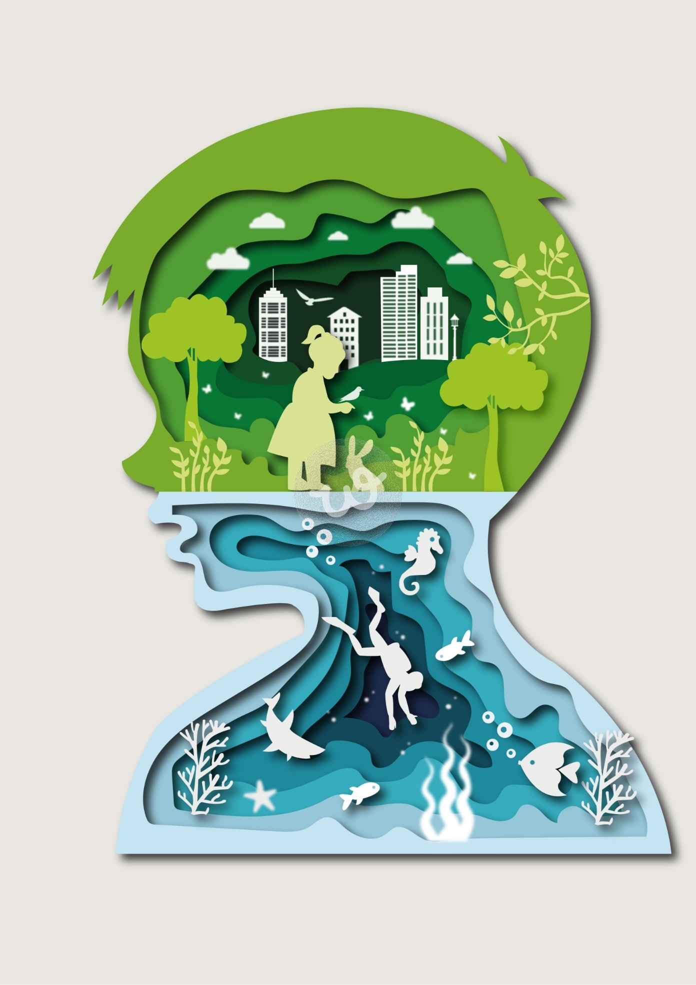 هذه اللوحة تعبر عن الازدواجية داخل الانسان بين عالمين مختلفين أحدهما مليء بالحياة والهدوء بين الطبيعة والمدينة والاخر يعكس عمق المشاعر والانغماس في المجهول تحت سطح الماء استخدمت تقنية الطبقات لتبدو بشكل 3d