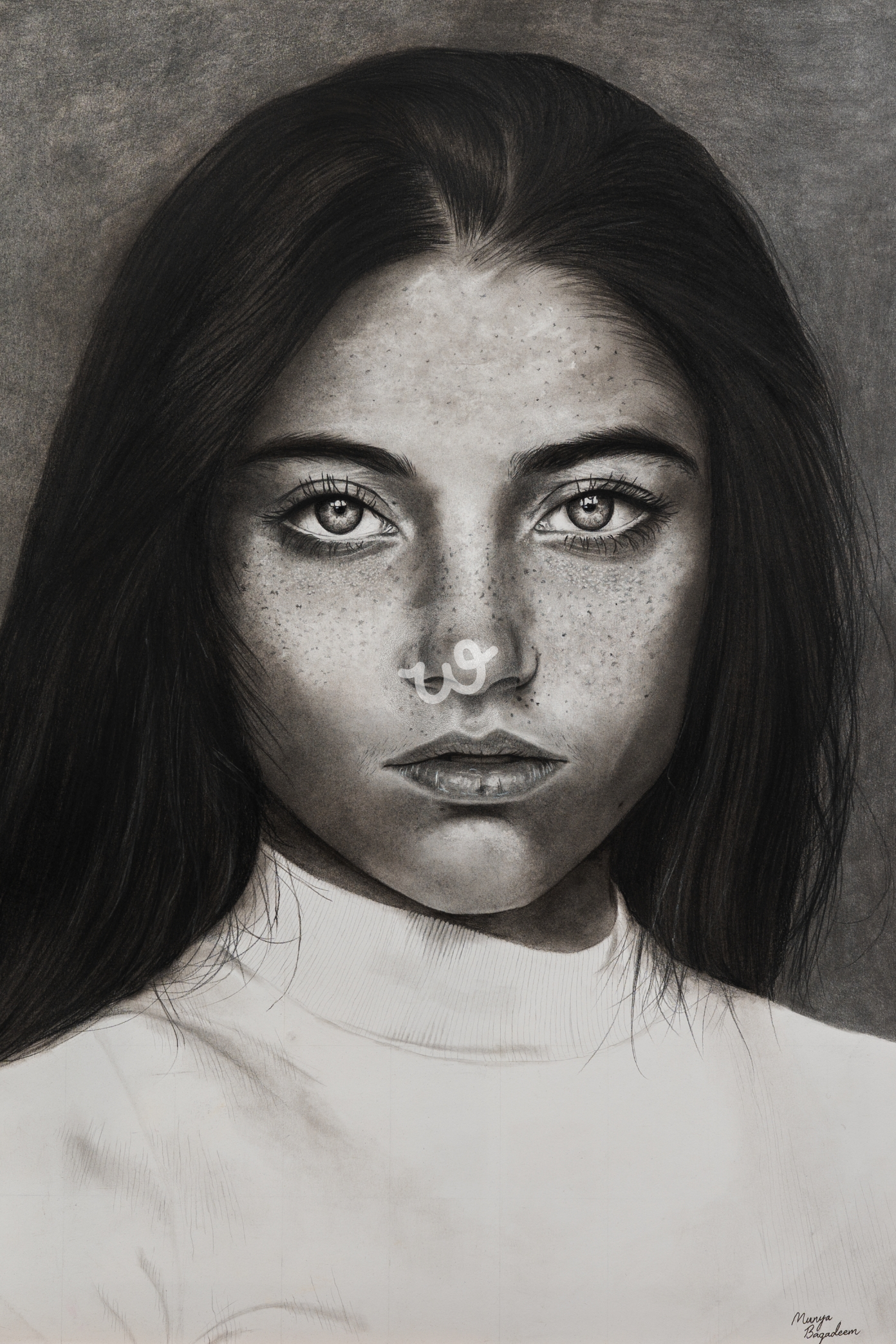 لوحة لبنت جميله ذات وجه به نمش مرسومه بالقلم الرصاص والفحم