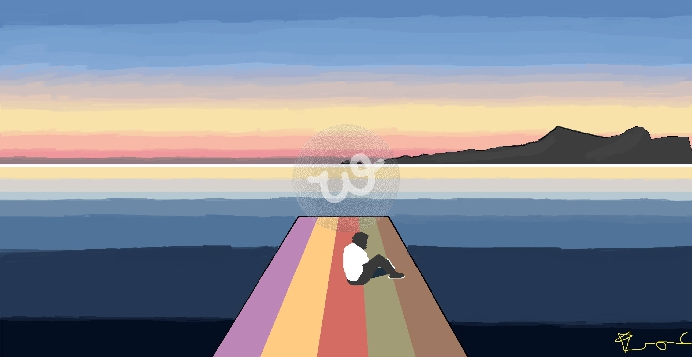 رسمة تم استخدام تطبيق الرسام لرسمها، رسمتها في ليلة ١٤/١٠/٢٠٢٥ ميلادي، وتم التعديل عليها قليلا فيما بعد الرسمة عن شخص وحيد جالس على ميناء خشبي يناظر الغروب على البحر مع منظر مزين بالجبال، يمكن ضايع، يمكن وجد الجواب، يمكن يتسائل عن حال الدنيا بس الاهم من هذا كله، انه للان يحاول. + تم استخدام الماوس فقط.