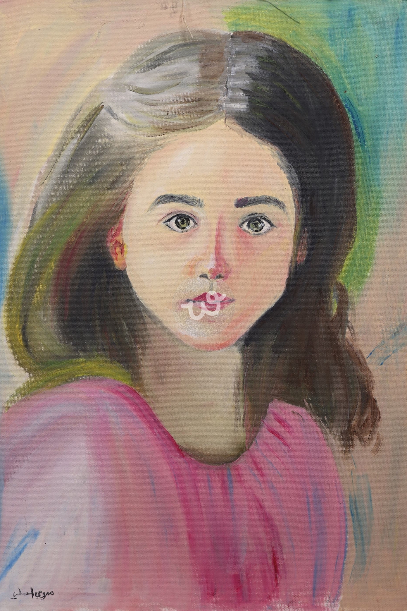 لوحة بورترية رائعة تظهر فتاة صغيرة ذات ملامح دقيقة وجميلة. ابتسامتها خفيفة ومشرقة، تعكس شعورًا بالسعادة والراحة. عيناها لامعتان وذات لون غامق يضيف عمقًا إلى التعبير. اللون المستخدم في اللوحة زاهي ومشرق، يضيف لمسة من الحيوية والنشاط. الخلفية بسيطة وملونة، تترك الفتاة في مركز الاهتمام. اللوحة بأكملها تعكس شعورًا بالسعادة والبراءة، وتظهر جمال الطفولة في كل تفاصيلها.