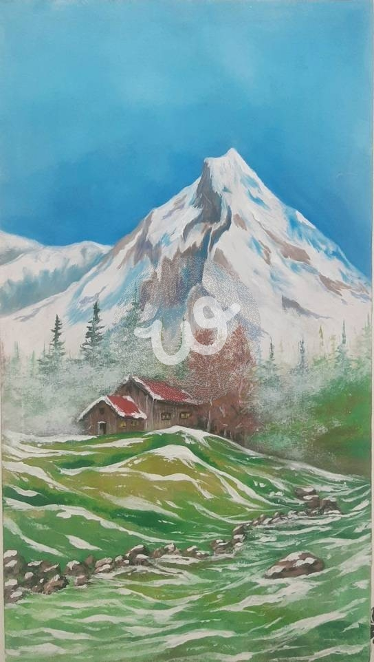 تجسّد اللوحة تباين الطبيعة بين صرامة الجبال المكسوّة بالثلج ودفء الحياة في الأسفل، حيث يقف كوخ صغير على بساطٍ من العشب الأخضر. يعكس المشهد توازنًا بصريًا بين البرودة والسكينة، وبين العزلة والاحتواء، في حوار هادئ بين القوة والطمأنينة.
