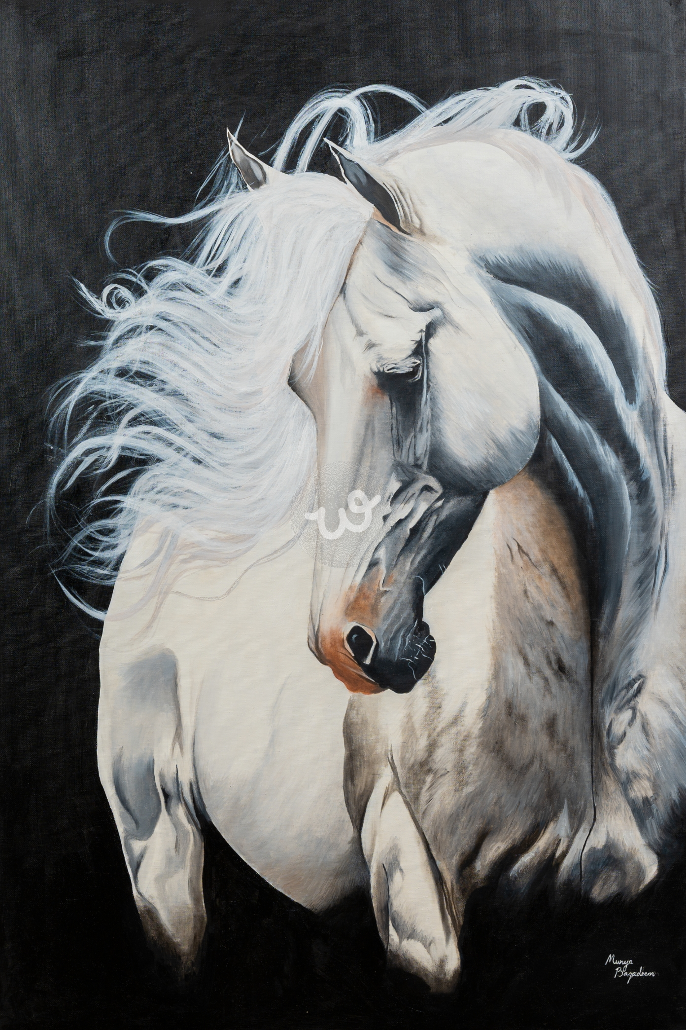 لوحة زيتية لحصان أبيض على خلفية سوداء تجسد الفخامة والجاذبية.