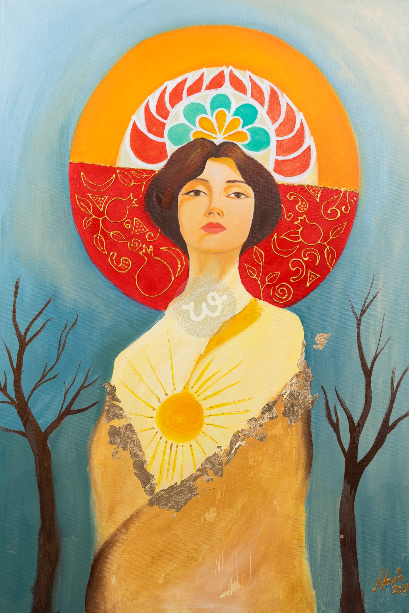 هذه اللوحه ذات طابع رمزي لوجه إمرأة تعبيره يتسم بالهدوء والثقة، محاطًا بهالة دائرية تضم عناصر زخرفية متشابكة، تجمع بين الألوان الدافئة مثل الأحمر والبرتقالي والأصفر. عنصر الشمس المشرق على شكل دائرة يرمز للطاقة والحياة، مع تأثيرات نسيجية من الذهب المُقشر، مما يضيف بُعدًا مادّيًا وحسيًا. يتدرج اللون الأزرق السماوي، مع وجود أشجار جرداء على الجانبين، مما يعطي إحساسًا بالتناقض بين الحياة والموت أو الخصب والجفاف. الاستخدام الذكي للمواد يعزز إحساس العمق والتأمل في مضمون اللوحة.