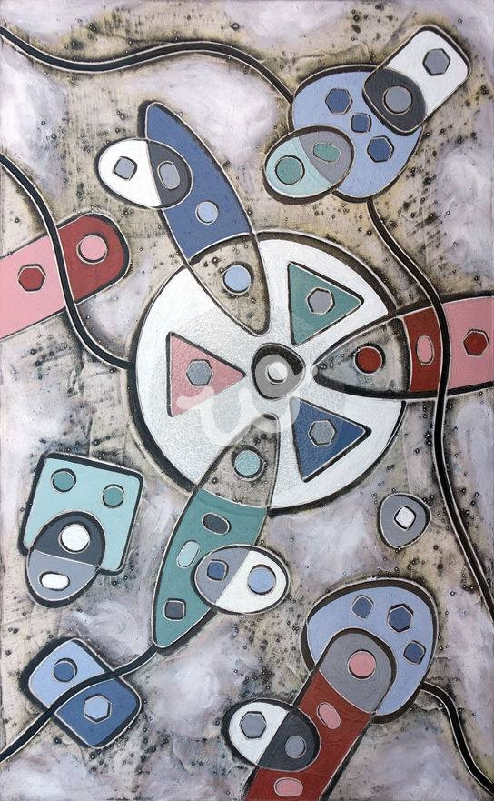 Oil and oxides on bas-relief in plaster on canvas With this collection, Andrea Benetti aims to highlight how abstract painting, at least in its embryonic form, traces its roots back to the very origins of our history, going as far as prehistoric cave paintings. In these primitive works, the use of symbols and chromatic forms already emerged, anticipating the fundamental principles of abstractionism, while maintaining a mysterious and primitive character.