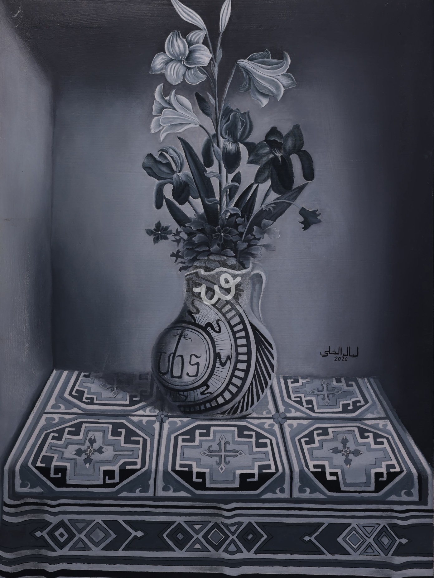 لوحة توحي بالهدوء والتأمل ويعكس مزيجاً من الفن التقليدي والحداثة باستخدام الالوان الاحادية.