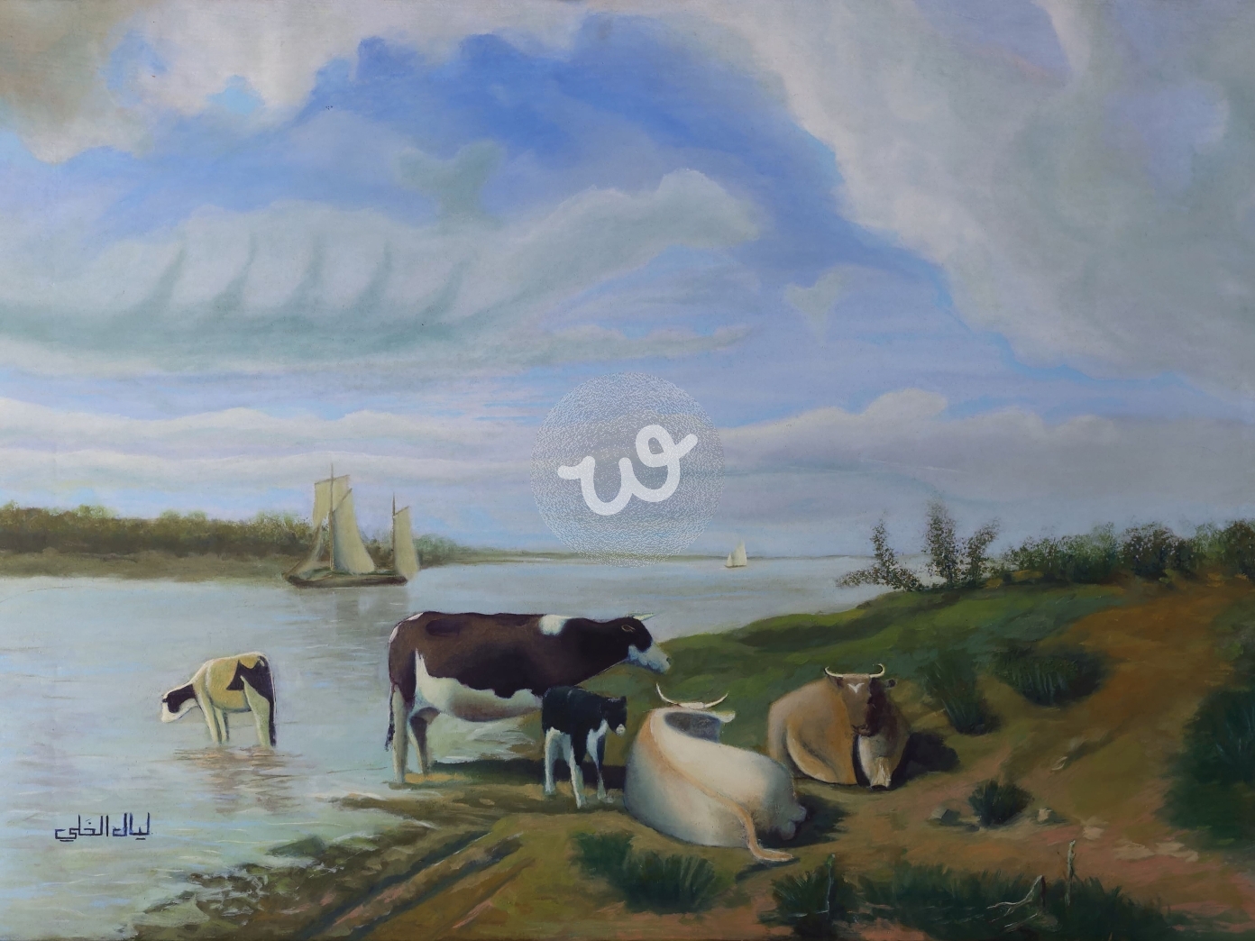 لوحه تحكي جمال الريف بظهور الابقار وتجمعها على ضفاف النهر واسترخاء المشاهد بجمال الطبيعة.