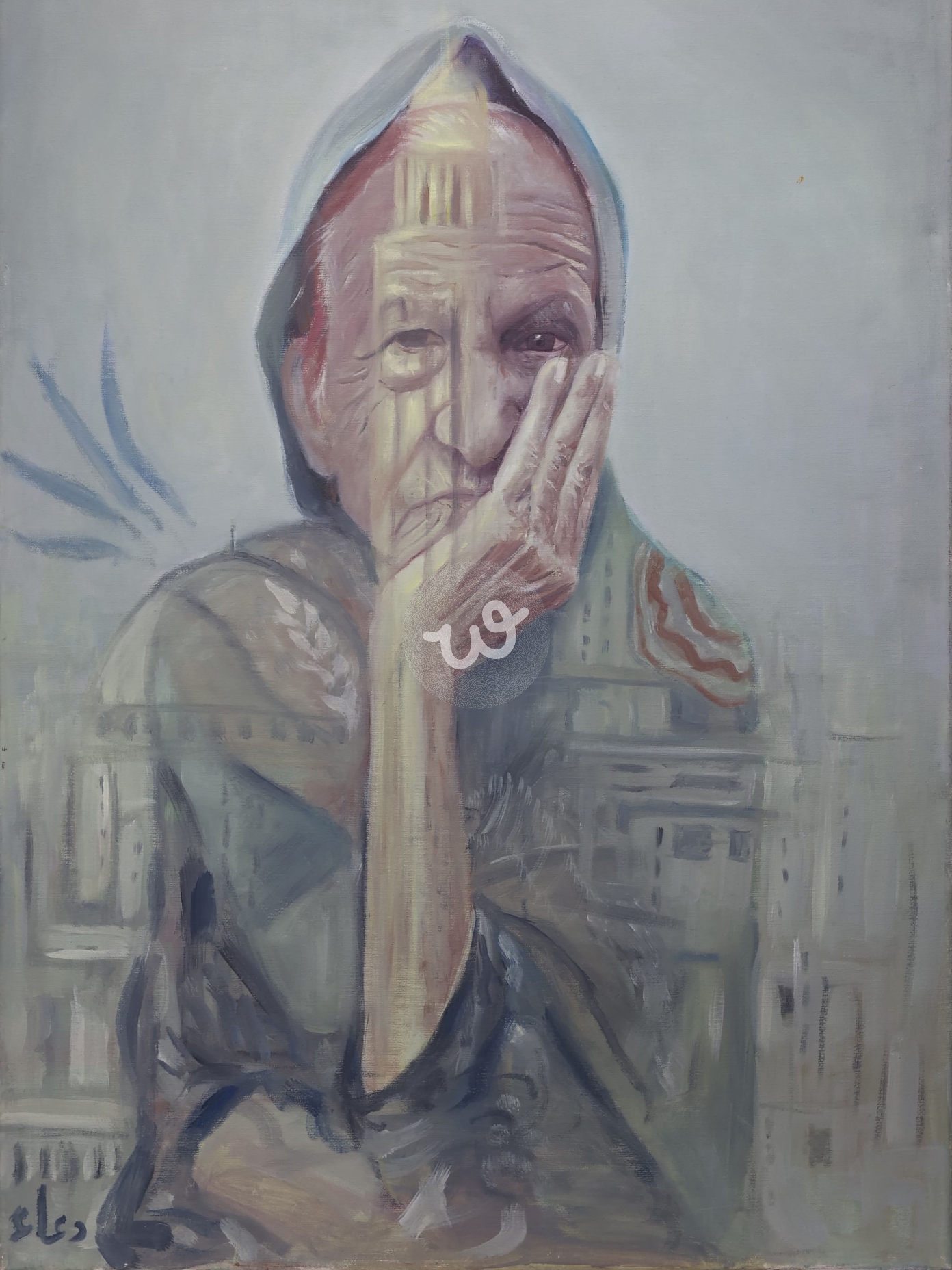 اللوحة تصور عجوزا بملامح حزينة تحمل في تعابيراتها ثقل الأحداث التي شكلت حياتها لتصبح انعكاسا صادقا للأزمات الانسانية التي نشهدها في الزمن الحالي .