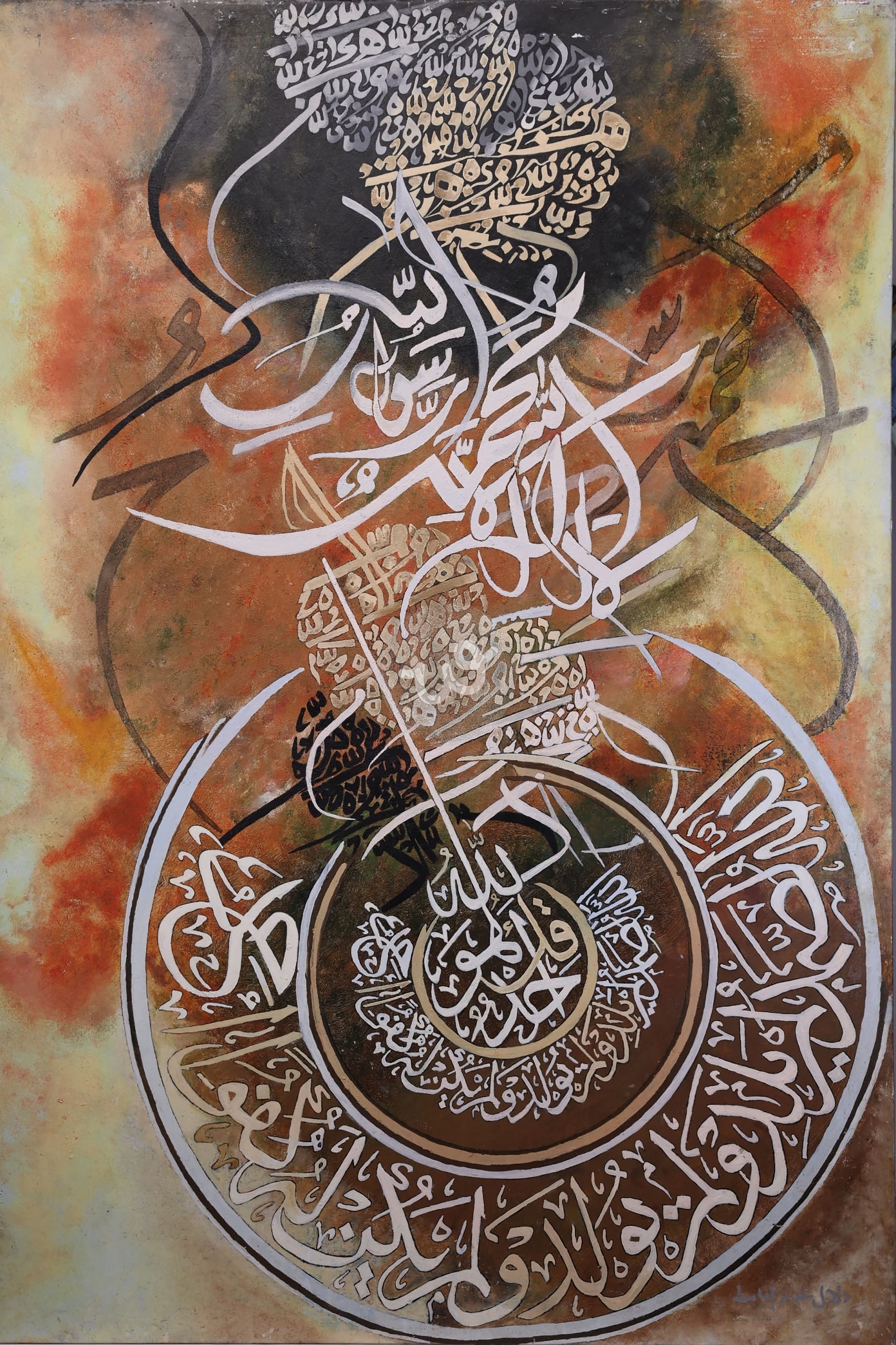 تتميز اللوحة بفن الخط العربي الذي يعكس عمق الثقافة الإسلامية. تجمع بين الألوان الدافئة والخطوط المنحنية، مما يخلق توازنًا بصريًا ملفتًا. تتضمن الكلمات المعبرة عن الإيمان والجمال، مما يساهم في إثارة المشاعر الروحية. تعتبر اللوحة تكريمًا للجمال الأدبي و الروحي في اللغة العربية.