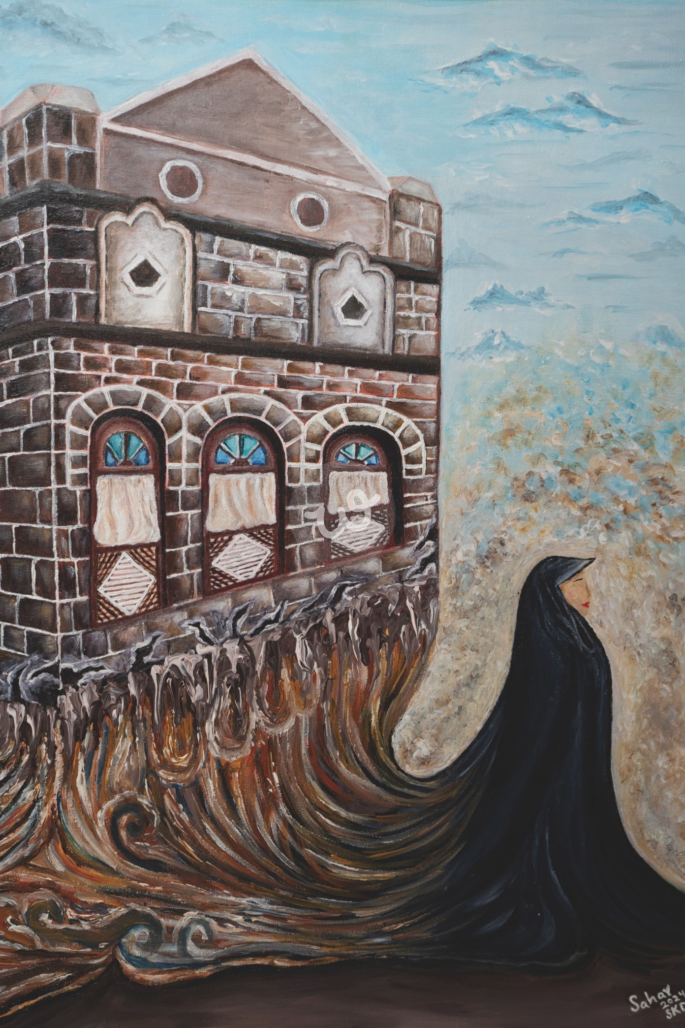 تعبر هذه اللوحة عن احتمالية اندثار التراث الثقافي وفقدان الهوية العدنية، حيث يظهر المنزل العدني القديم بتصميمه المعماري رمزًا للهوية الثقافية، ولكنه يبدو في حالة انهيار تدريجي، حيث يتشقق ويتحول إلى تراب. الربط البصري بين انهيار المبنى واختفاء الشيدر العدني يعكس العلاقة العميقة بين الإنسان وتراثه الثقافي، والتأكيد على أن الثقافة ليست مجرد موروث مادي، بل جزء لا يتجزأ من هوية الإنسان يجب علينا الحفاظ عليها من الاندثار.