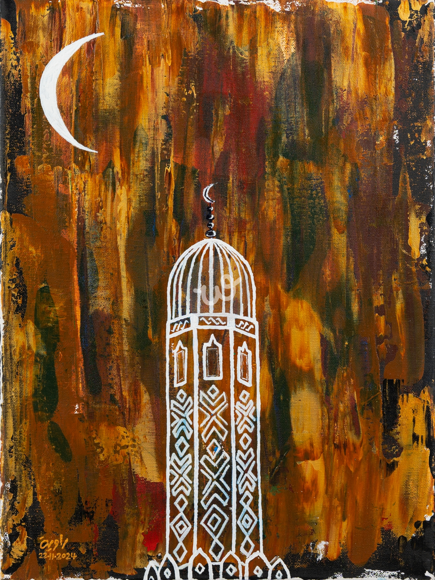 هذه اللوحة مرسومة بالوان اكريليك على قماش كانڤاس،هذه اللوحة ضمن سلسلة صنعاء أيضاً ،في هذه اللوحة رسمت مأذنة جامع بتفاصيلها المعمارية الجميلة مع التركيز على اللون الأبيض الذي يميز العمارة في هذه المدينة .