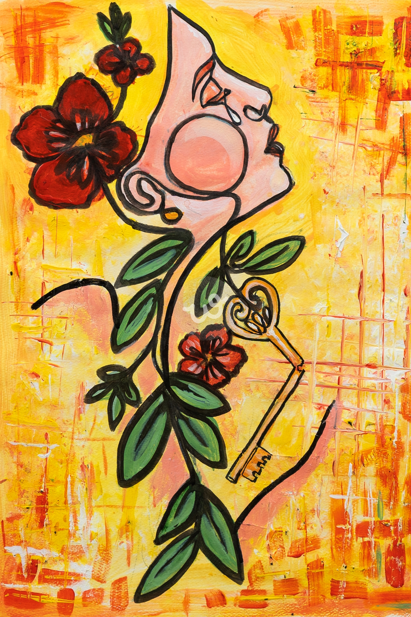 اللوحة تعبر عن صراع داخلي بين الأمل والحزن، حيث يرمز رفع الرأس للأعلى إلى الطموح والتطلع نحو المستقبل، بينما الورود حول الرقبة تمثل الجمال والعاطفة المحبوسة. المفتاح المكسور يشير إلى إحساس بالعجز أو فقدان القدرة على الوصول إلى حل، والدمعة على العين تمثل الألم والتضحية التي ترافق هذا البحث المستمر عن الفرج