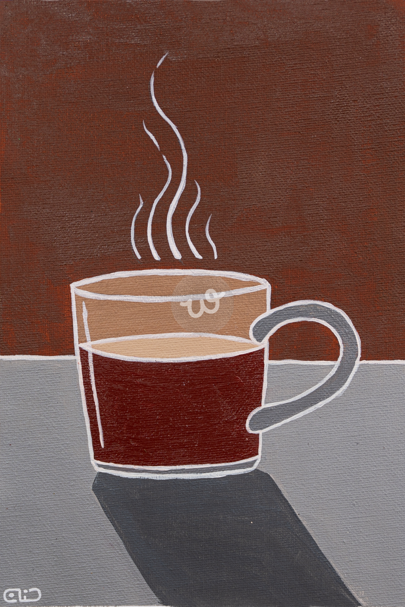 بين الهدوء والسكون يظهر كوب الشاي الأحمر يتعالى منه البخار الذي يرقص في الهواء كأنما يهمس لأرواحنا لتأخذنا إلى مكان بعيد عن الضوضاء تغمره السكينة والدفء.. رسمت بالوان اكريليك