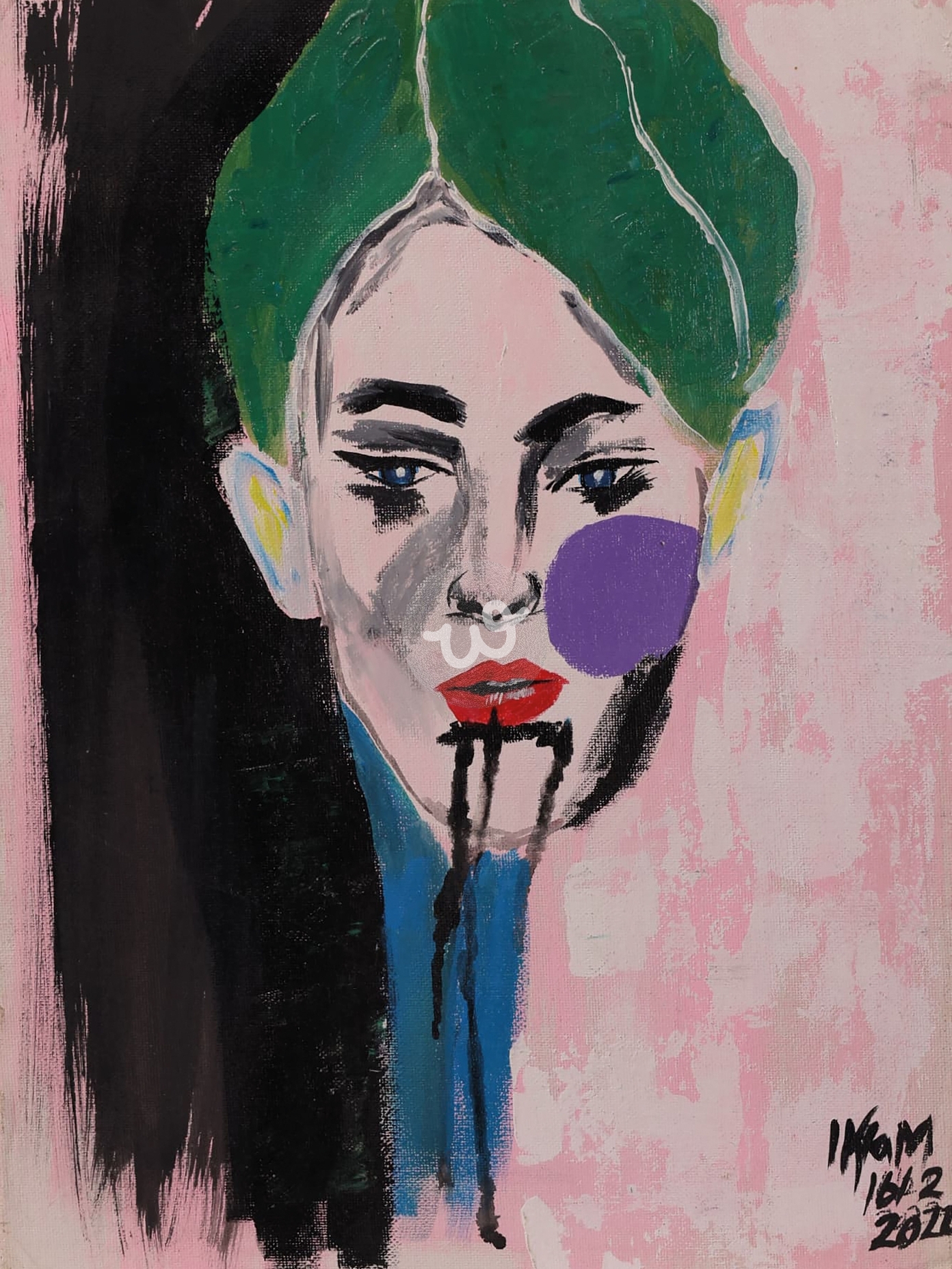 تعبر هذه اللوحة عن الصراع الداخلي والبحث عن الذات، حيث تظهر امرأة بملامح متباينة وألوان جريئة تعكس تعدد الأحاسيس.