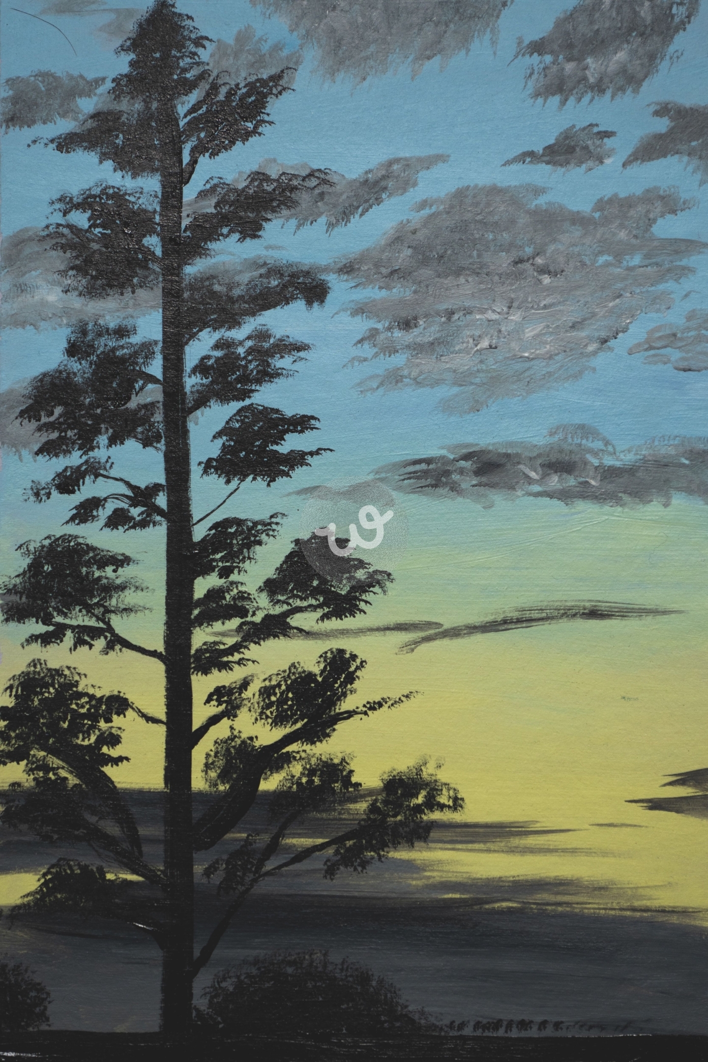 مشهد طبيعي لأفق عند الغروب، حيث تمتزج ألوان السماء بين الأزرق والأصفر، بينما تقف شجرة طويلة شامخة وسط المشهد، محاطة بغيوم رمادية هادئة. يغمر المشهد إحساس عميق بالسلام والتأمل، وكأن الزمن قد تباطأ لوهلة ليتسنى للروح أن تستمتع بهذه اللحظة النقية. الشجرة الشامخة تقف بصمت، تحمل في جذورها صمود الأيام، بينما تراقب الغيوم المتناثرة رحلة الشمس نحو الغروب. هناك دفء خفي في الأفق، يشبه ذكريات جميلة تلامس القلب بهدوء، تهمس للروح أن هناك دائمًا جمالًا في النهايات الهادئة.