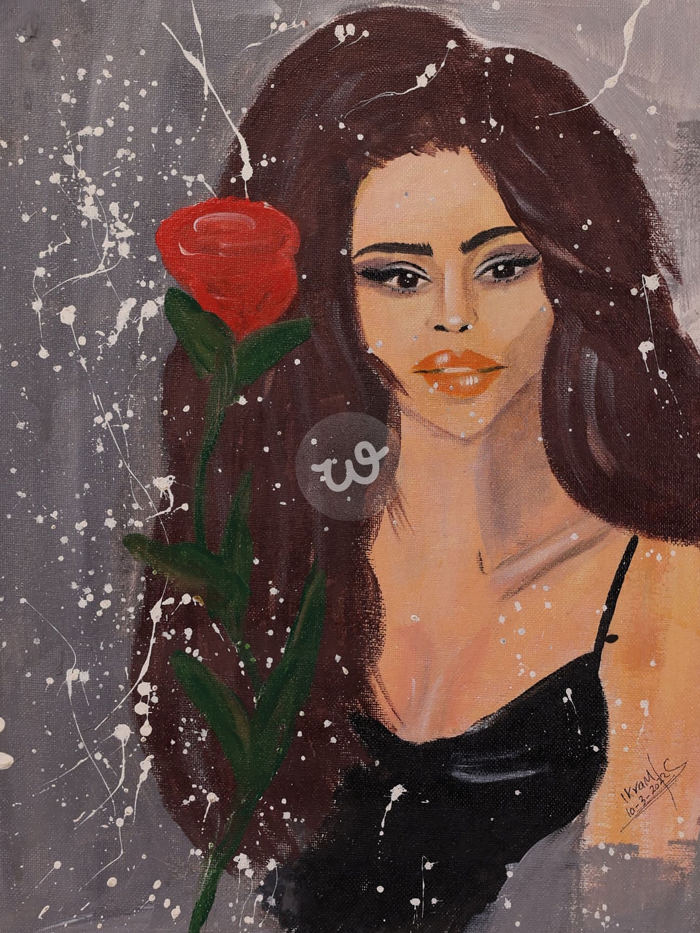 تجسد هذه اللوحة قوة المرأة وصلابتها في مواجهة تحديات الحياة. تظهر امرأة بنظرة ثابتة وشعر متدفق، تمسك بوردة حمراء تتحدى تيارات الزمن.
