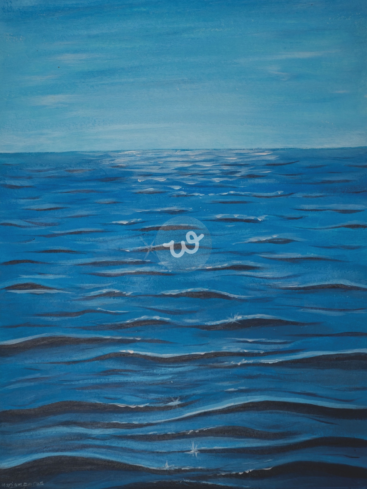 تعكس اللوحة اتساع المحيط وصفائه حيث تمتد الامواج الهادئه تحت سماء صافيه بلون ازرق نقي ينعكس ضوء الشمس على سطح الماء مكونة بريقا متلألاً يضفي لمسة من السحر والهدوء تجسد اللوحة احساسا بالسلام والتأمل مما يجعل المشاهد يشعر وكأنه يحدق في الأفق البعيد متأملا روعة الطبيعة وسحر البحر اللامتناهي.