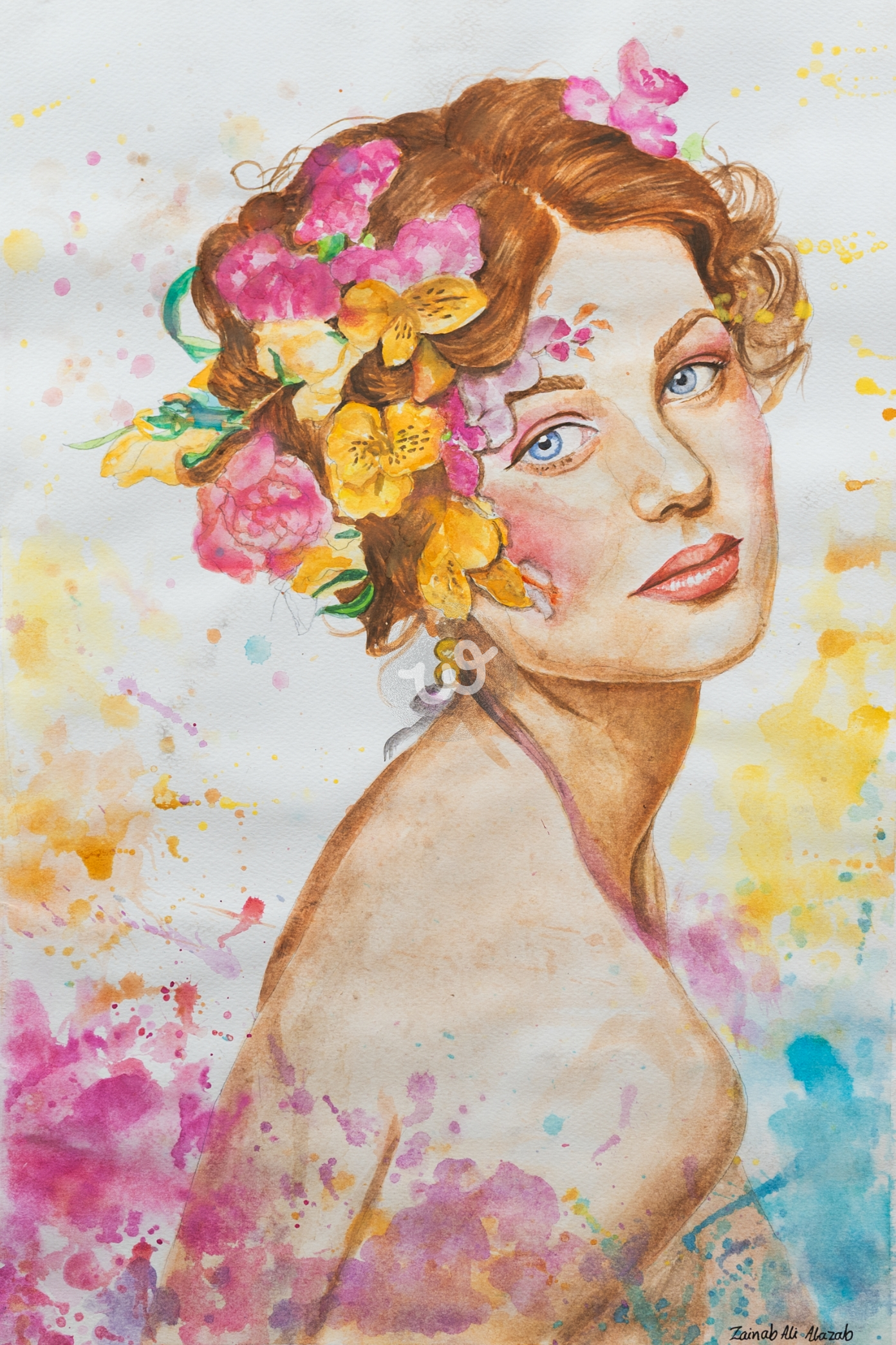 اللوحة تعبر عن الفرح والحيوية، حيث يرمز الشعر الشقراء إلى النقاء والانتعاش، بينما الورود المرسومة على الشعر تعكس الجمال الطبيعي والتجدد المستمر. التفافها إلينا بابتسامة مرحة يبعث على التفاؤل والحرية، والأنماط المتطايرة من حولها تمثل انفجارًا من الطاقة والإبداع التي لا تنتهي، مما يعكس الروح المتجددة والمفعمة بالحياة
