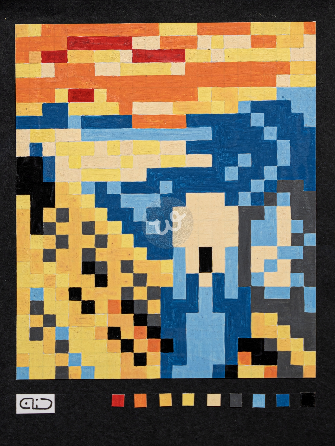 بتقنية البكسل تصبح الصرخة أكثر تعبيرا عن حالة نفسية مشوهة، مربعات الالوان تتداخل وتشوش في وجه العذاب الداخلي. اللوحة تحمل صراعا مستمرا كأنها تعبر عن قسوة الحياة من خلال كل جزء صغير في اللوحة.. مرسومة بالالوان الزيتية
