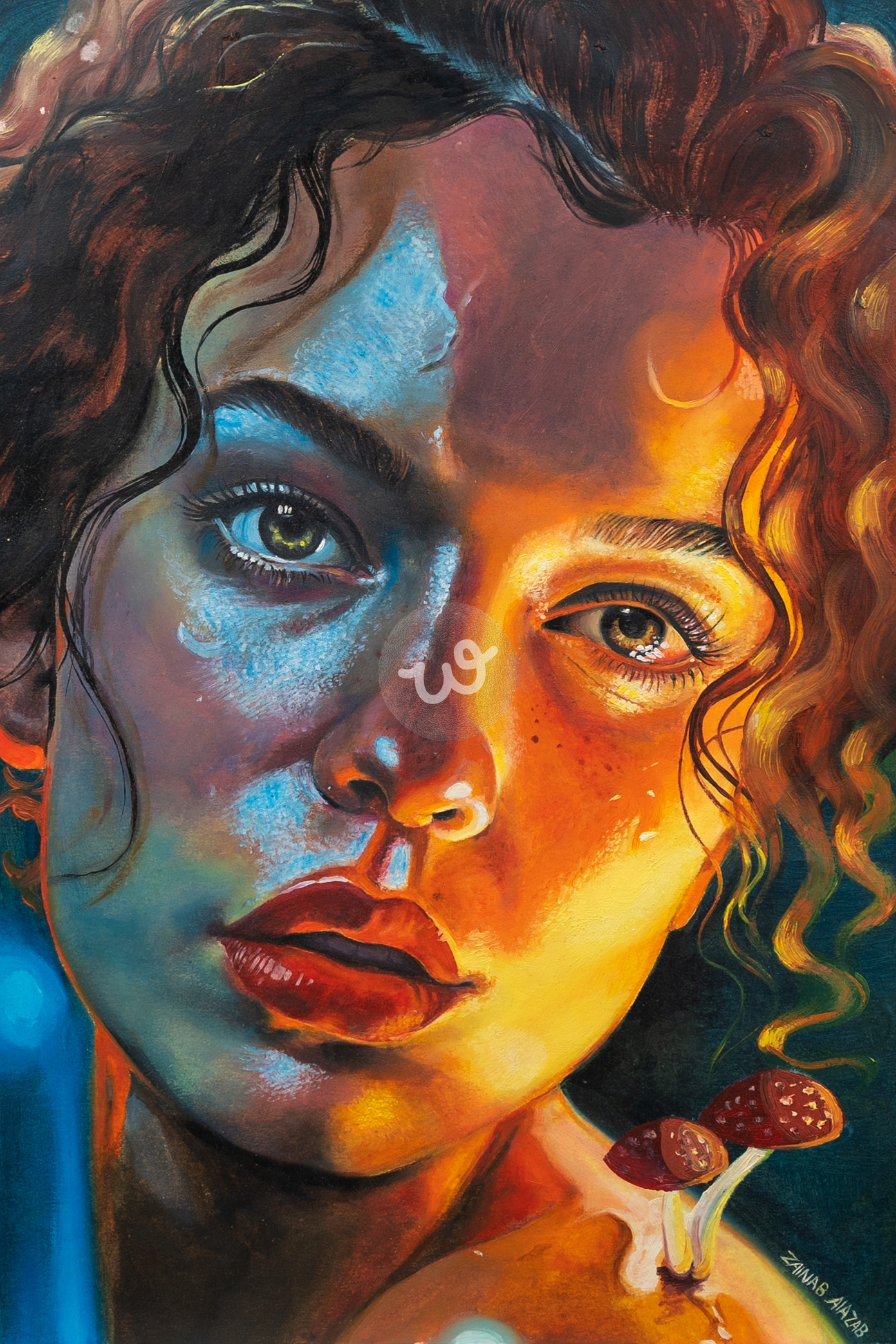 اللوحة تجسد حالة من اللامبالاة العاطفية، حيث يعكس الوجه الخالي من التعبير صراعًا داخليًا أو انقطاعًا عن المشاعر، بينما الضوء الأحمر والأزرق وراءها يمثل التوتر بين العاطفة والعقل. الفطر الذي ينمو على كتفها يرمز إلى النمو الخفي أو التحولات التي تحدث رغم الجمود الظاهر