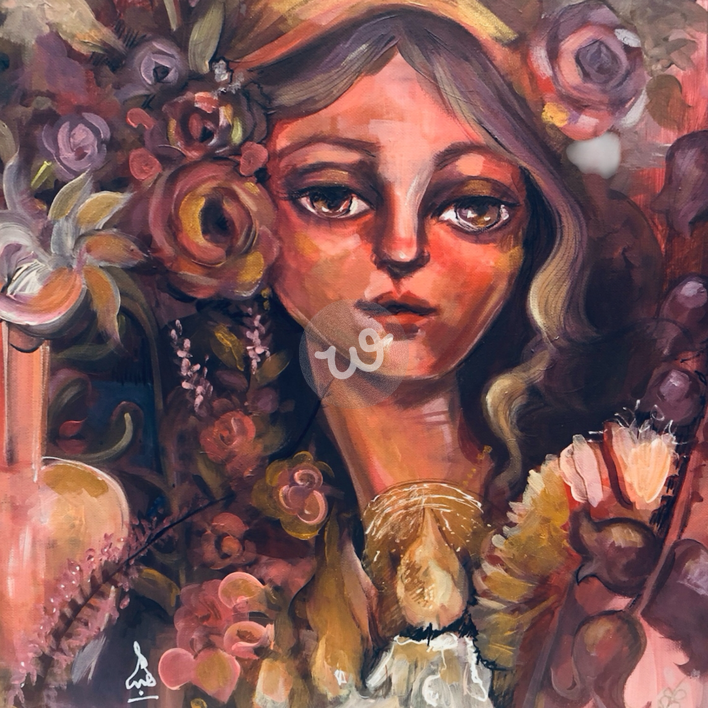 لوحة الشمعة أكريليك على كانڤاس اللوحة حول وجه أنثوي مائل نحو الطابع الرمزي، يتمركز في قلب التكوين الفني ويجذب العين مباشرة. الملامح هادئة، مائلة للحزن أو التأمل، ما يمنح اللوحة طابعًا نفسيًا داخليًا عميقًا